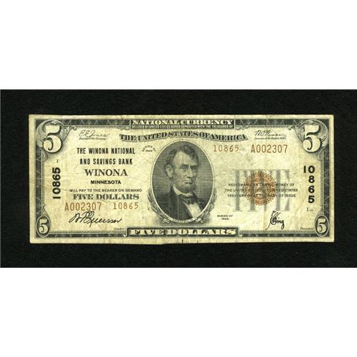 <B>Winona, MN</B></I> - $5 1929 Ty. 2 <B>The Winona National & Savings Bank</B></I> Ch. # 10865<BR>This issue first chartered under the name of Winona National Bank. It changed its name in May of 1928 before issuing small size with the new title. <B>Fine.</B></I><BR><BR><b>Shipping:</b> Coins & Currency (<a target="_blank" href="http://www.heritageauctions.com/common/shipping.php">view shipping information</a>)