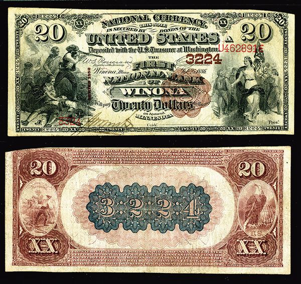 Fr#496, S/N U462891 / 3324 pp A, PMG graded Very Fine 25, 3 large margins just touching upper right corner, 55 Large notes known on this bank, this is one of only 2 Brown back, $20's in the Census and the finest known of the two. Rare opportunity for the Minnesota collector.