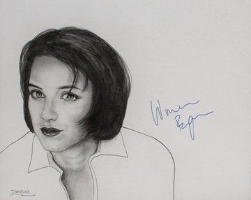 Black and white pencil drawing of Winona Ryder by Joseph Namsinh, signed by the actress in blue felt pen. Signed in Beverly Hills in 1993. Measures 16 x 20.
