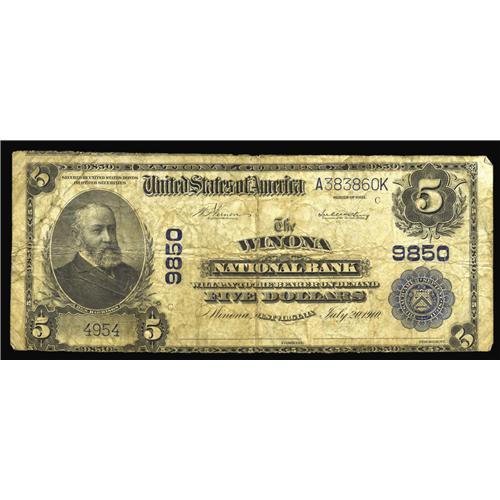 <B>Winona, WV</B></I> - $5 1902 Plain Back Fr. 601 <B>The Winona NB</B></I> Ch. # 9850<BR>This new addition to the Kelly census brings the total number of notes know to three. Lee Long and W.W. Michael served as principals when this example was issued. There is some light staining, but other than that it is complete and problem free. <B>Very Good.</B></I>