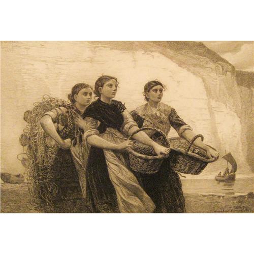 Winslow Homer, Etching, Girls with baskets, 8" x 11",Signed in plate, 1883, Printed and Signed in pencil by Master Printer James D. Smillie lower right.