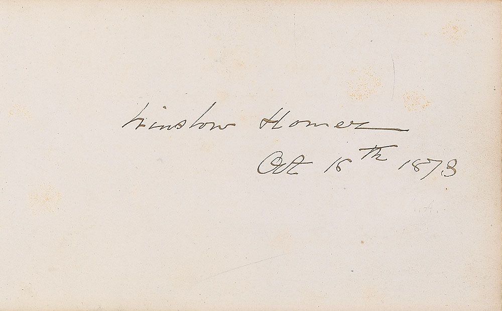 Desirable ink signature, “Winslow Homer, Oct. 16th 1873,” on an off-white 6.25 x 4 album page. In fine condition.