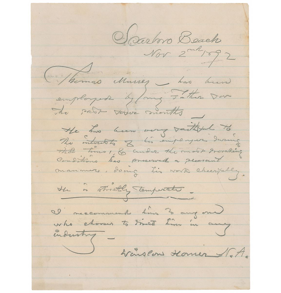 ALS in pencil, signed “Winslow Homer N. A.,” one page, 8 x 10.5, November 2, 1892. A letter of recommendation, in full: “Thomas Murrey—has been employed by my Father for the past four months. He has been very faithful to the interests of his employer during that time, & under the most provoking conditions has preserved a pleasant manner, doing his work cheerfully. He is strictly temperate. I reccommend [sic] him to any one who chooses to direct him in any industry.” Intersecting folds (one vertical fold passing through a single letter of the signature) and scattered creases and soiling, otherwise fine condition.