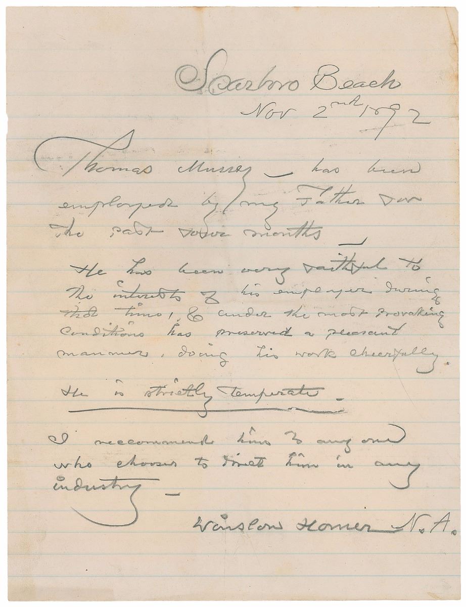 ALS in pencil, signed “Winslow Homer N. A.,” one page, lightly lined, 8 x 10.5, November 2, 1892. A letter of recommendation written from his Scarborough Beach studio in Maine, in full: “Thomas Murrey—has been employed by my Father for the past four months. He has been very faithful to the interests of his employer during that time, & under the most provoking conditions has preserved a pleasant manner, doing his work cheerfully. He is strictly temperate. I reccommend [sic] him to any one who chooses to direct him in any industry.” Intersecting folds (one vertical fold passing through a single letter of the signature) and scattered creases and soiling, otherwise fine condition.
