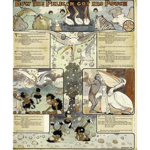 <B>Winsor McCay - A Tale of the Jungle Imps by Felix Fiddle, "How the Pelican Got His Pouch" Hand Colored Illustration Original Art, dated 2-22-03 (Cincinnati Enquirer, 1903).</B></I> Biographer John Canemaker detailed the history of <B>Tales of the Jungle Imps</B></I> in his superb monograph, <B>Winsor McCay, His Life and Art</B></I>. He wrote, "Of all Winsor McCay's work experiences during his five years on Cincinnati newspapers, none would prove more significant for his future than the proto-comic strip he created for the <B>Enquirer</B></I>." Forty-three episodes, based on poems written by George Randolph Chester, ran from January 11 to November 9, 1903. The stories took their cues from Rudyard Kipling's approach in <B>Just So Stories for Children</B></I>. In each episode, an animal's anatomy is "explained" through whimsical stories involving a trio of naughty "jungle imps," and their skirmishes with various species. As John Canemaker notes, "<I>Tales of the Jungle Imps</B></I> was Winsor McCay's first attempt in an extended series format to bring together all of his eclectic talents in a cohesive graphic style. On each page he found fresh ways to combine his exquisite draftsmanship, dynamic staging, sense of caricature, mastery of perspective, and feeling for motion with his version of the decorative art nouveau style." This delightful episode, the sixth in the series, was drawn in ink and hand colored using watercolor paint. Original illustrations, completely hand colored by Winsor McCay, are a rarity. As a result, the <I>Tales of the Jungle Imps</B></I> examples used in the Canemaker biography were shot from newspaper tear sheets, rather than originals. The image area of this superb, scarce example measures 18" x 22.5". The story captions are pasted-on, typeset stats. There are some small stains along the borders, and a bit of edge wear to the illustration board; otherwise, the art is in Very Good condition.