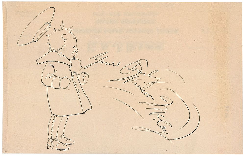 Cartoonist and animator (1871–1934) best known for Little Nemo and Gertie the Dinosaur. Original vintage signed fountain pen sketch of Little Sammy Sneeze sneezing on an off-white sheet folded to a size of 8 x 5. In fine condition, with a couple vertical folds, as well as a few creases.