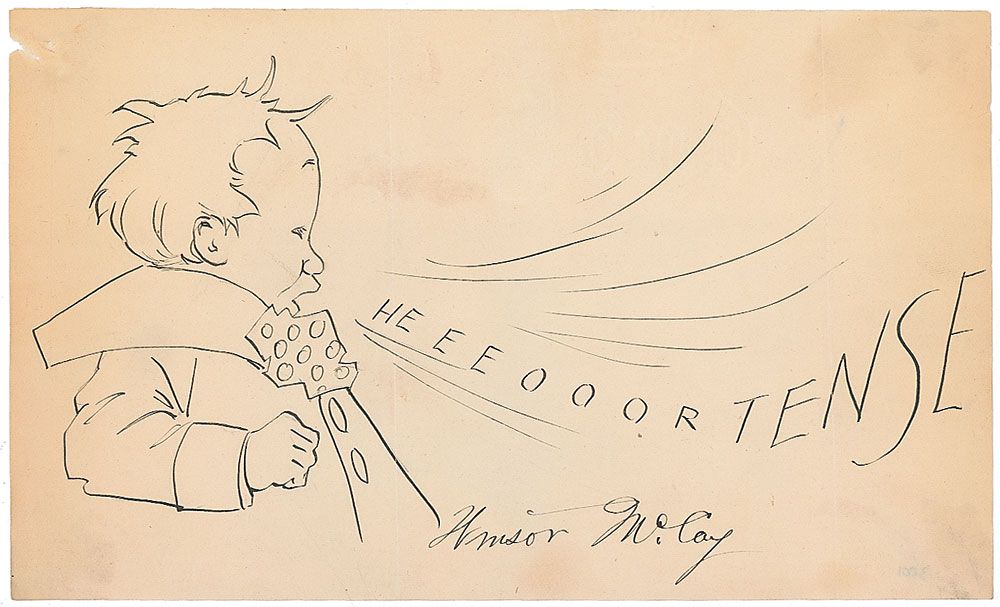 Cartoonist and animator (circa 1867/71–1934) best known for Little Nemo and Gertie the Dinosaur. Original vintage signed ink sketch of Little Sammy Sneeze sneezing on an off-white 8.5 x 5 sheet, with the inscription incorporated into the sneeze, and signed at the bottom by McCay. In fine condition, with two vertical folds and a bit of inconsequential paper loss to top left corner.