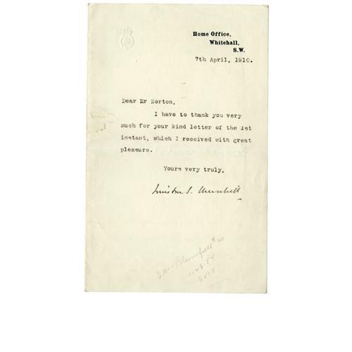 <B>Winston Churchill 1910 Autograph Letter Signed</B></I> "<I>Winston S. Churchill</B></I>" as Home Secretary. One page, 5" x 8", Home Office, Whitehall letterhead, London, April 7, 1910, to a Mr. Norton. A brief letter of acknowledgement with a handsome signature. At this time in his life, Churchill was Secretary of State for the Home Office, a senior position in Herbert Henry Asquith's Liberal Party government. Fine condition; one fold and some light soiling that could easily be cleaned. From the Henry E. Luhrs Collection. Accompanied by LOA from PSA/DNA.