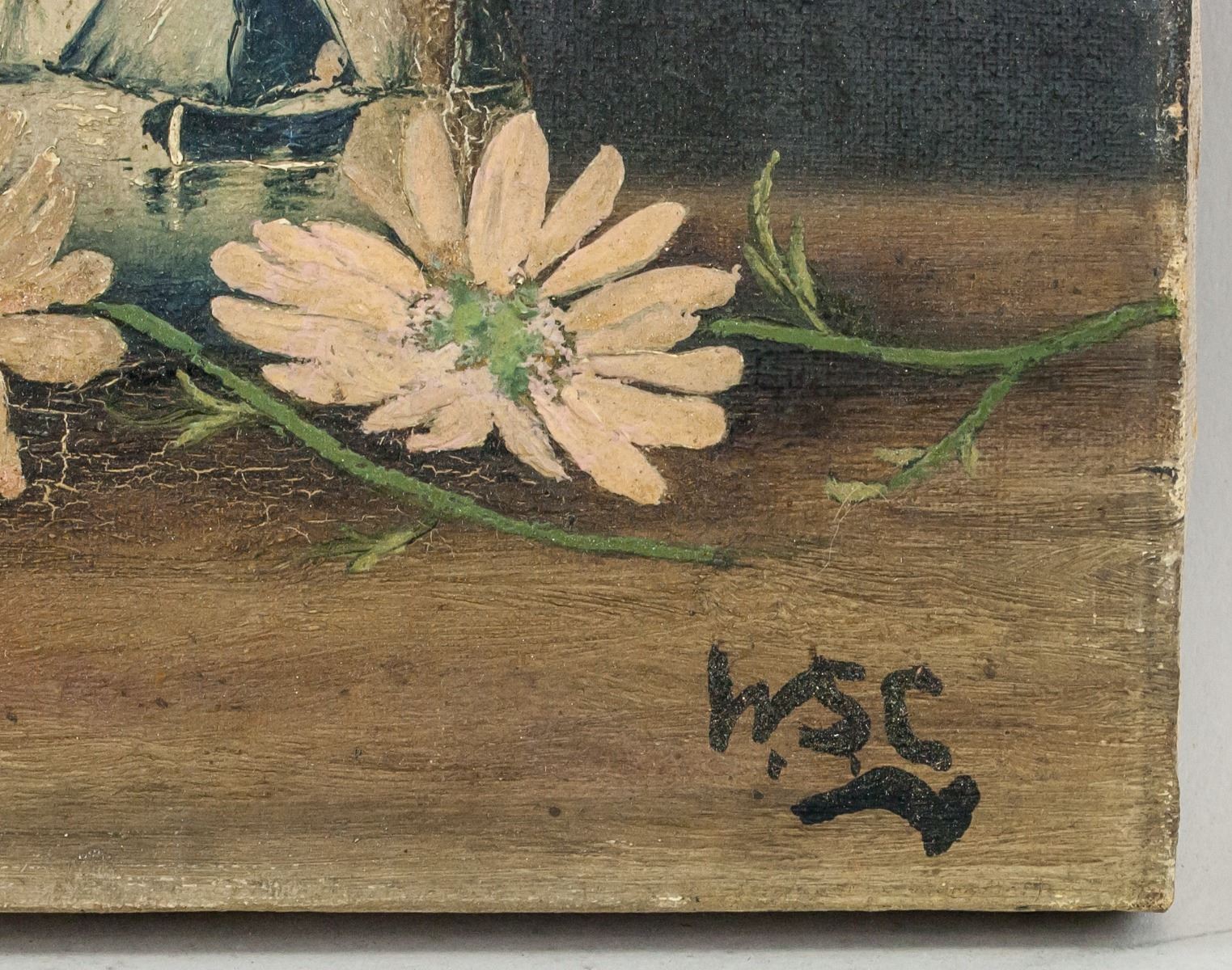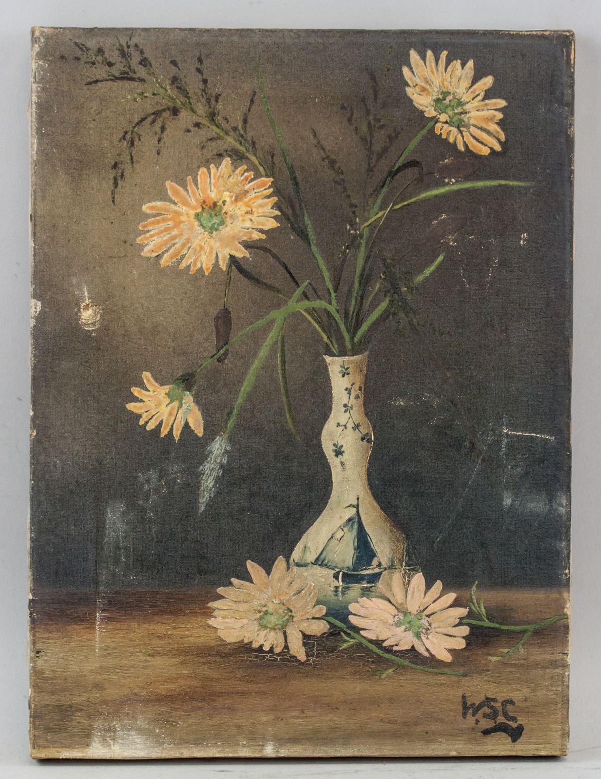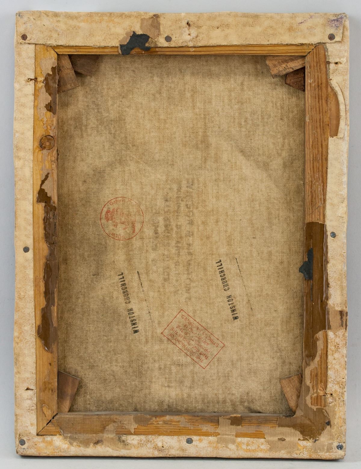 Oil on canvas. Featuring a still life of flowers in vase. Signed WSC on the lower right corner. Stamped WINSTON CHURCHILL and Galerie Beyeler PARIS on verso. Another stamp inscribed THE COPYRIGHT OF THIS PAINTING IS THE PROPERTY OF THE ARTIST AND IS STRICTLY RESERVED. Attributed to Winston Churchill (1874-1965, British). A hole on canvas surface on upper left side. 31 x 23 cm (12 x 9 inches). PROVENANCE: Private European collection