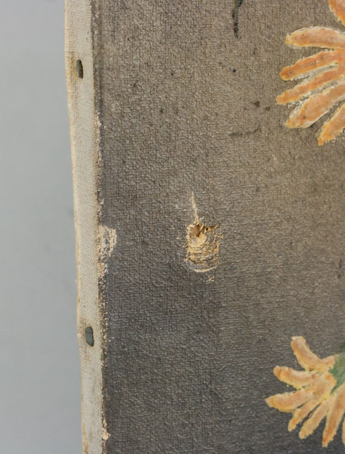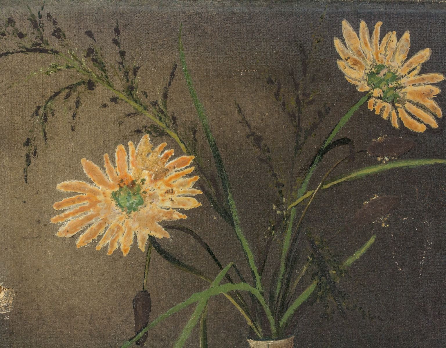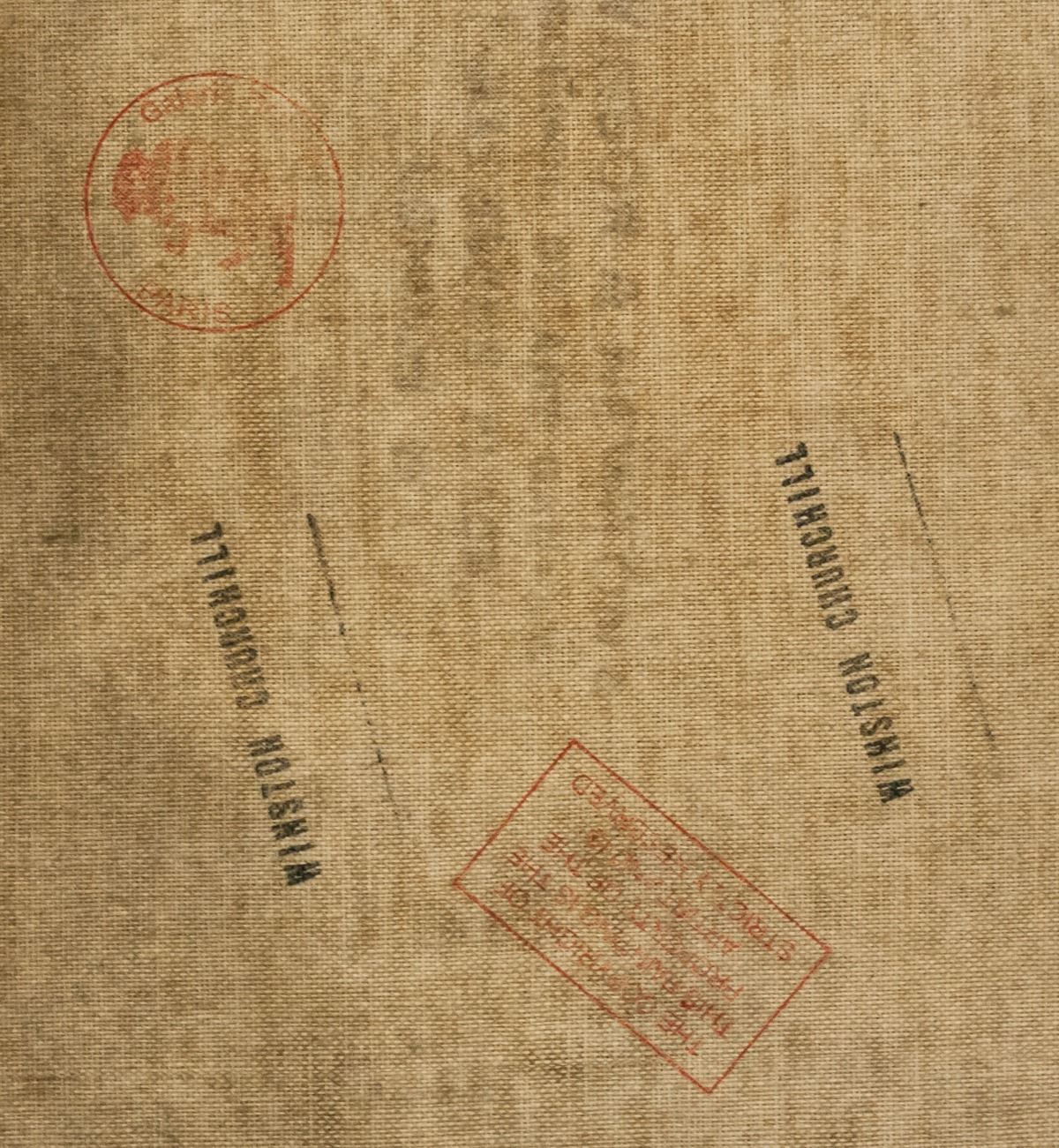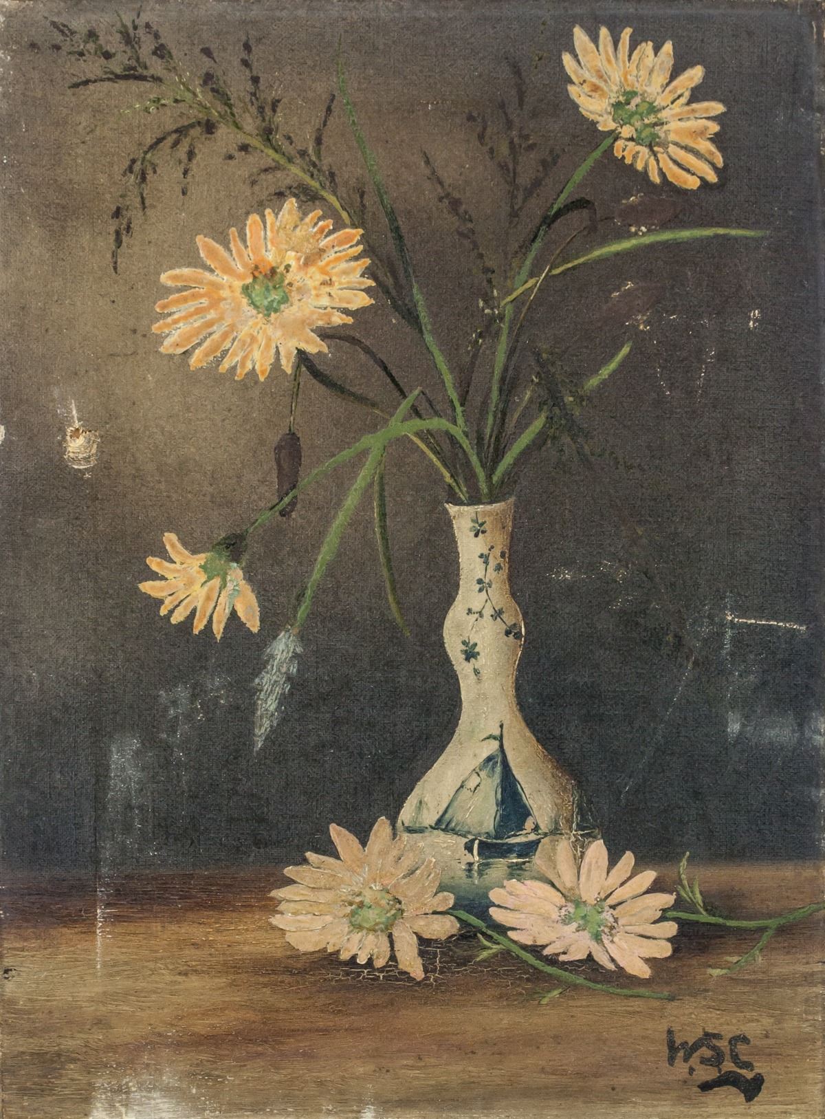 Oil on canvas. Featuring a still life of flowers in vase. Signed WSC on the lower right corner. Stamped WINSTON CHURCHILL and Galerie Beyeler PARIS on verso. Another stamp inscribed THE COPYRIGHT OF THIS PAINTING IS THE PROPERTY OF THE ARTIST AND IS STRICTLY RESERVED. Attributed to Winston Churchill (1874-1965, British). A hole on canvas surface on upper left side. 31 x 23 cm (12 x 9 inches). PROVENANCE: Private European collection