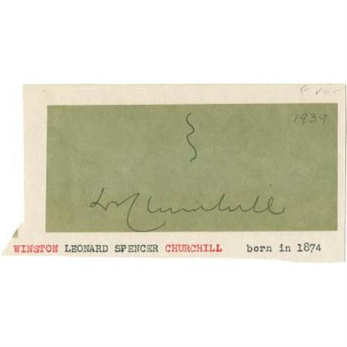 <B>Winston Churchill Clipped Signature,</B></I> "<I>W Churchill</B></I>", 4.5" x 2". A bold signature of Britain's greatest modern statesman. On dark gray stock, very fine condition.<BR><BR><b>Shipping:</b> Flat Material, Small (<a target="_blank" href="http://www.heritageauctions.com/common/shipping.php">view shipping information</a>)