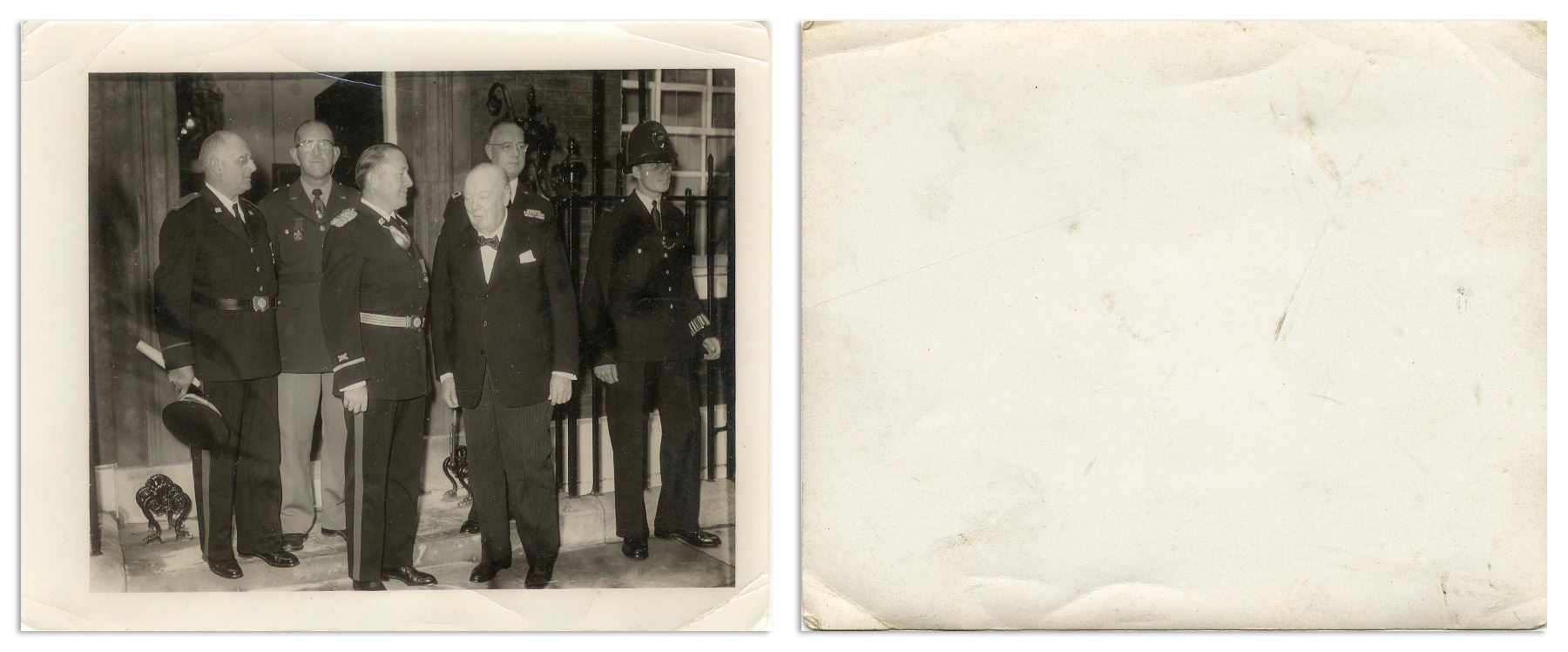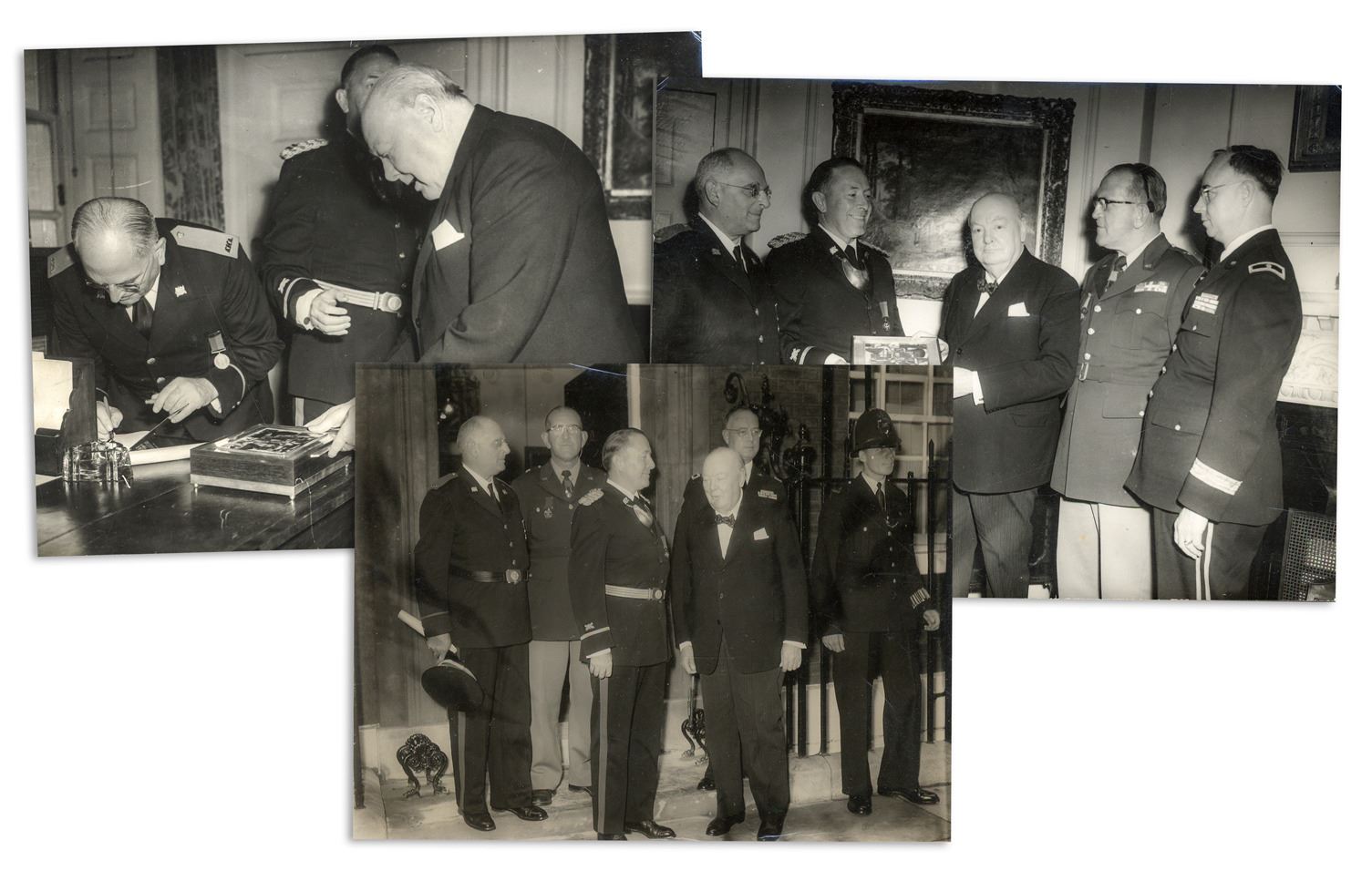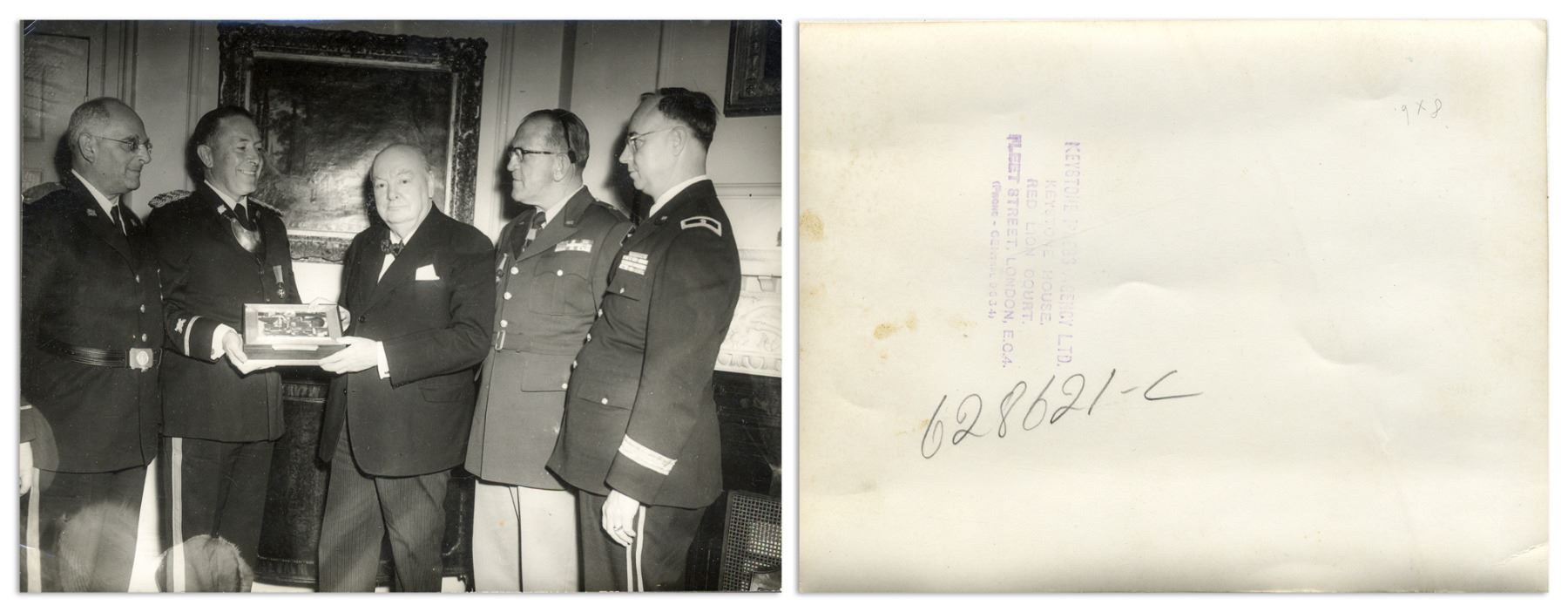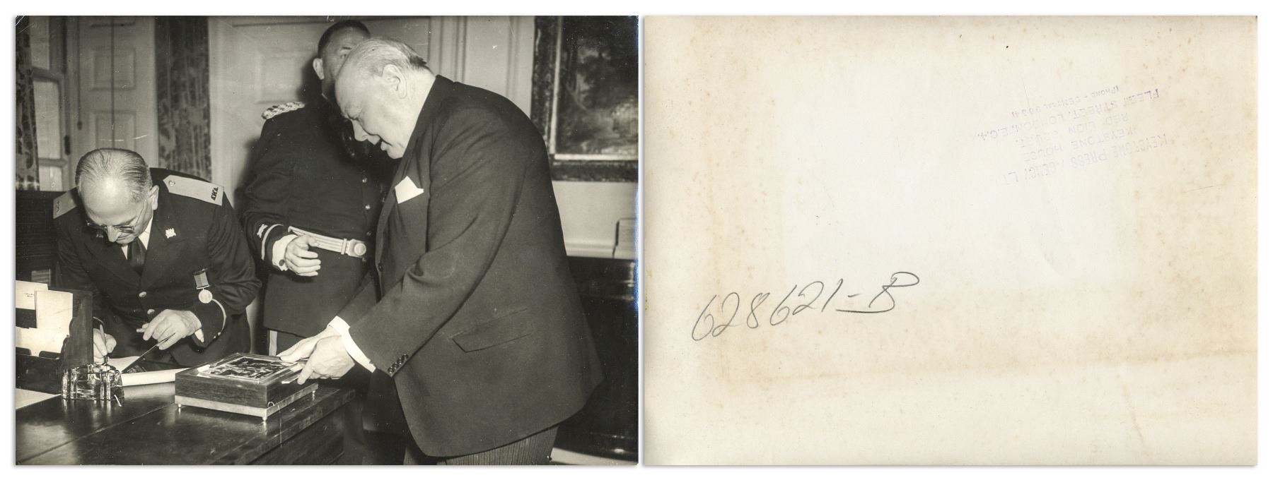 Winston Churchill lot of press photos showing the Prime Minister accepting a gift of a humidor. Lot is comprised of three glossy silver gelatin photos, with two measuring approximately 7.75'' x 5.75'', and one measuring 5'' x 4''. The two larger photos both have backstamps by the Keystone Press Agency, Ltd. of Fleet Street, London on their versos. Some curling and light wear to these photos, overall very good. The smaller photo has no backstamp. Some creasing and mild bends to corners of this photo, overall very good condition. From the estate of WWII U.S. Army officer Fred E. Pereira, who appears wearing glasses, standing next to Churchill in the photo showing the Prime Minister accepting the humidor.