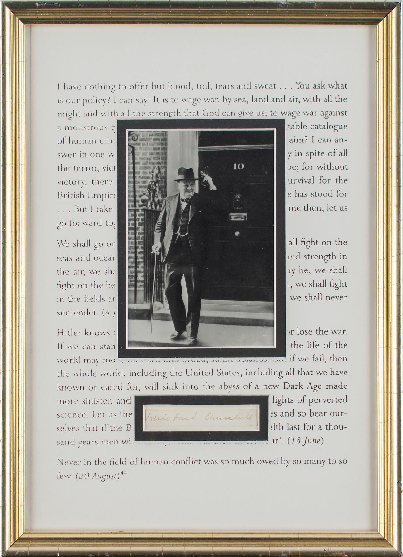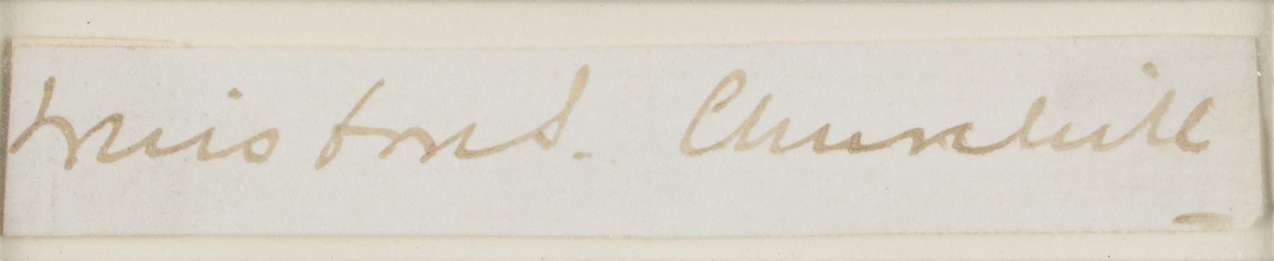 Fountain pen signature, "Winston S. Churchill,” on an off-white 2.75 x .5 slip. Double-matted and framed with a portrait of Churchill leaving 10 Downing Street to an overall size of 9.5 x 13.5; the mat is imprinted with the text from his 'Blood, Toil, Tears and Sweat' speech, making for an interesting display. In fine condition.