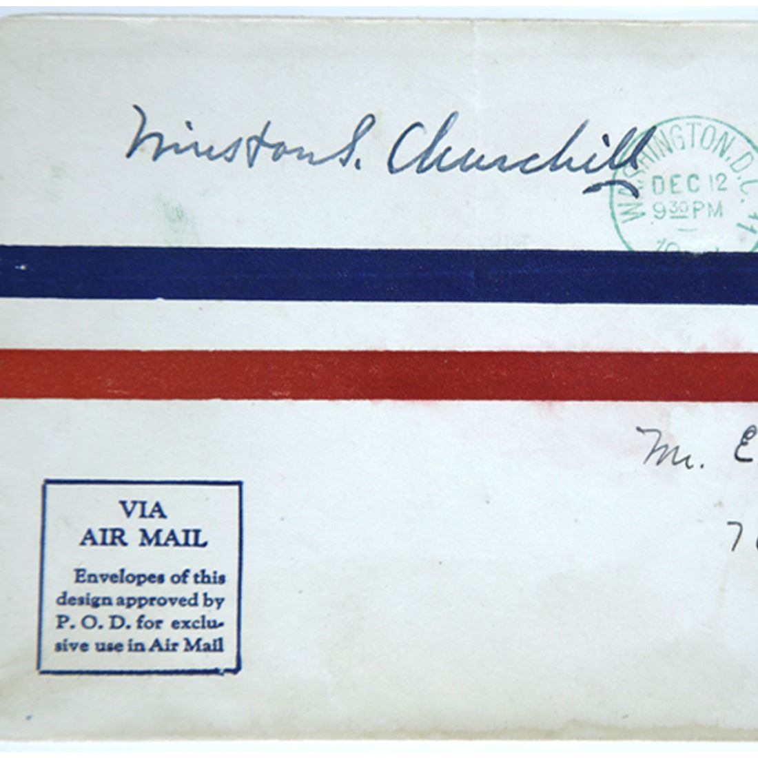 Winston Churchill (November 30, 1874 - January 24, 1965). Winston Churchill signed Postmarked Air Mail Envelope. Signature is signed in black ink. Ink has aged over time. Envelope has a 5 Cent International Civil Aeronautics Conference Stamp. Winston Churchill was an inspirational statesman, writer, orator, and leader who led Britain to victory in the Second World War. He served as Conservative Prime Minister twice - from 1940 to 1945 (before being defeated in the 1945 general election by the Labor leader Clement Attlee) and from 1951 to 1955. Churchill was awarded the Nobel Prize in Literature in 1953 for his many published works. This item has been professionally custom matted and framed. Comes with a Letter of Authentication from Guaranteed Forensic Authenticators, along with the GFA guarantee of authenticity.