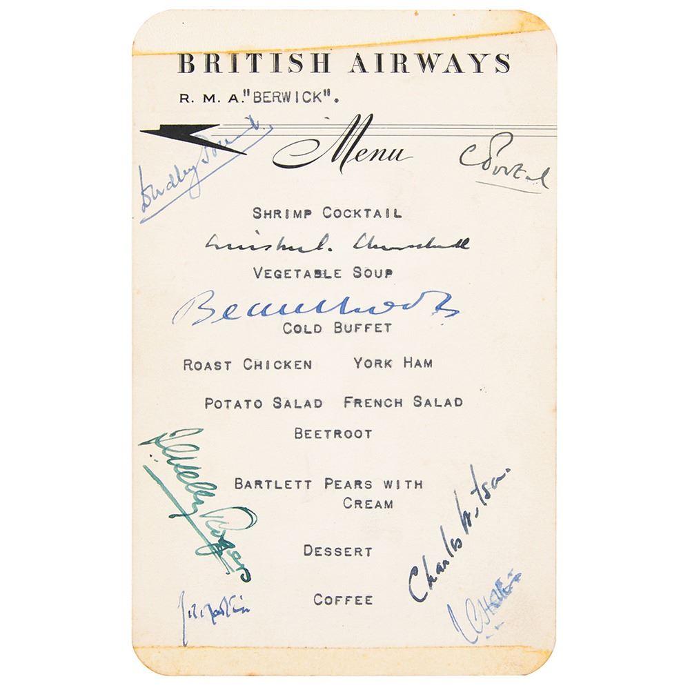 Historic British Airways menu for a mid-Atlantic dinner on the Boeing Clipper flying boat RMA 'Berwick' on January 16, 1942, 4.25 x 6.75, signed in fountain pen for Steward Victor Arthur Partridge by attendees including Winston Churchill and members of his war cabinet: First Sea Lord Admiral Sir Dudley Pound, Air Chief Marshall Sir Charles Portal, Minister for Aircraft Production Lord Beaverbrook, Senior Assistant Secretary Gen. Leslie C. Hollis, Principal Private Secretary John Martin, his personal physician Charles Wilson, and pilot John Cecil Kelly-Rogers. Includes the original "La Corona / S. M. Kaplan / Habana" band from the cigar that Churchill smoked after the meal, removed with a cigar cutter by Partridge at the time of serving. In overall very good to fine condition, with old tape stains and some surface loss to the top and bottom edges of the menu card, not affecting or impinging on the signatures.