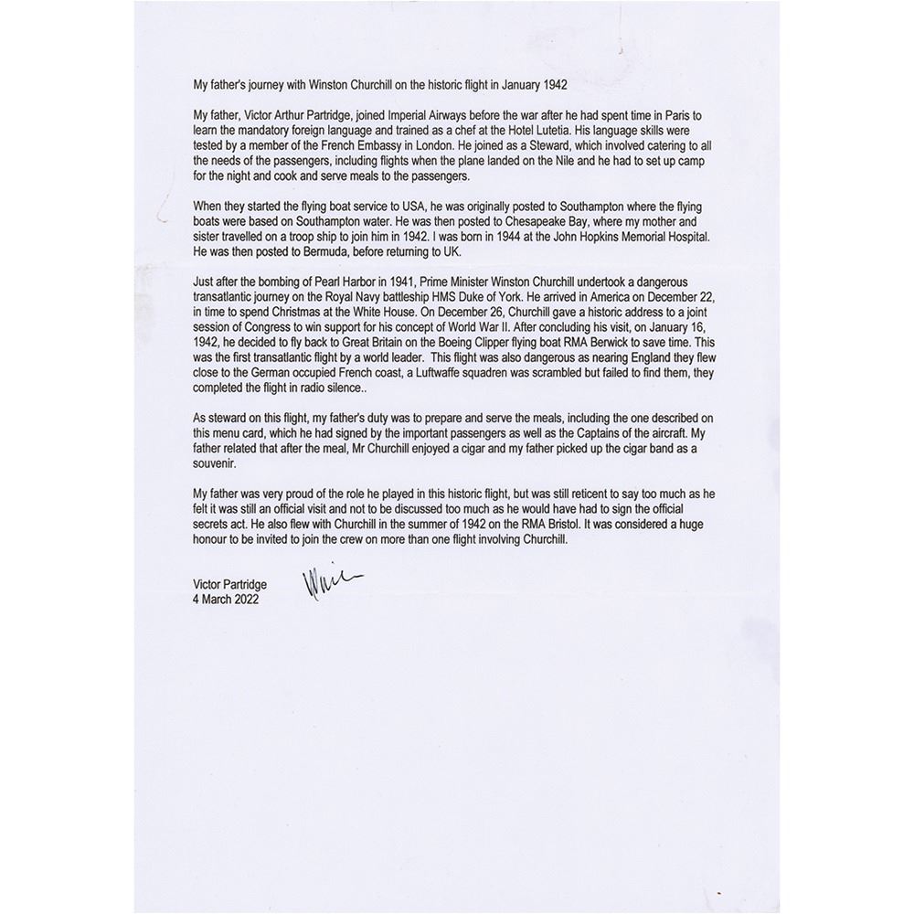 Accompanied by a letter of provenance from the son of Victor Arthur Partridge, discussing his father's career with Imperial Airways (which later became British Airways) and his role on this significant flight. In small part: "As steward on this flight, my father's duty was to prepare and serve the meals, including the one described on this menu card, which he had signed by the important passengers as well as the Captains of the aircraft. My father related that after the meal, Mr. Churchill enjoyed a cigar and my father picked up the cigar band as a souvenir.