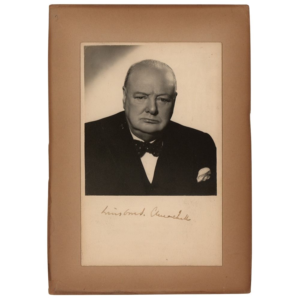 Iconic vintage matte-finish 3.5 x 5.5 portrait of Winston Churchill by Vivienne of London, signed in the lower border in fountain pen, "Winston S. Churchill." Affixed to a 5 x 7 mount and in very good to fine condition, with light surface scuffing and slight fading to ink.