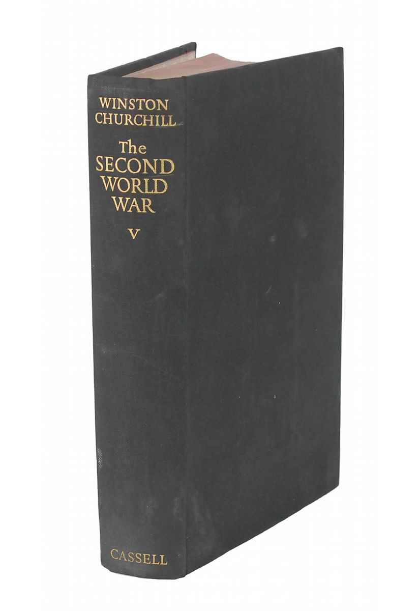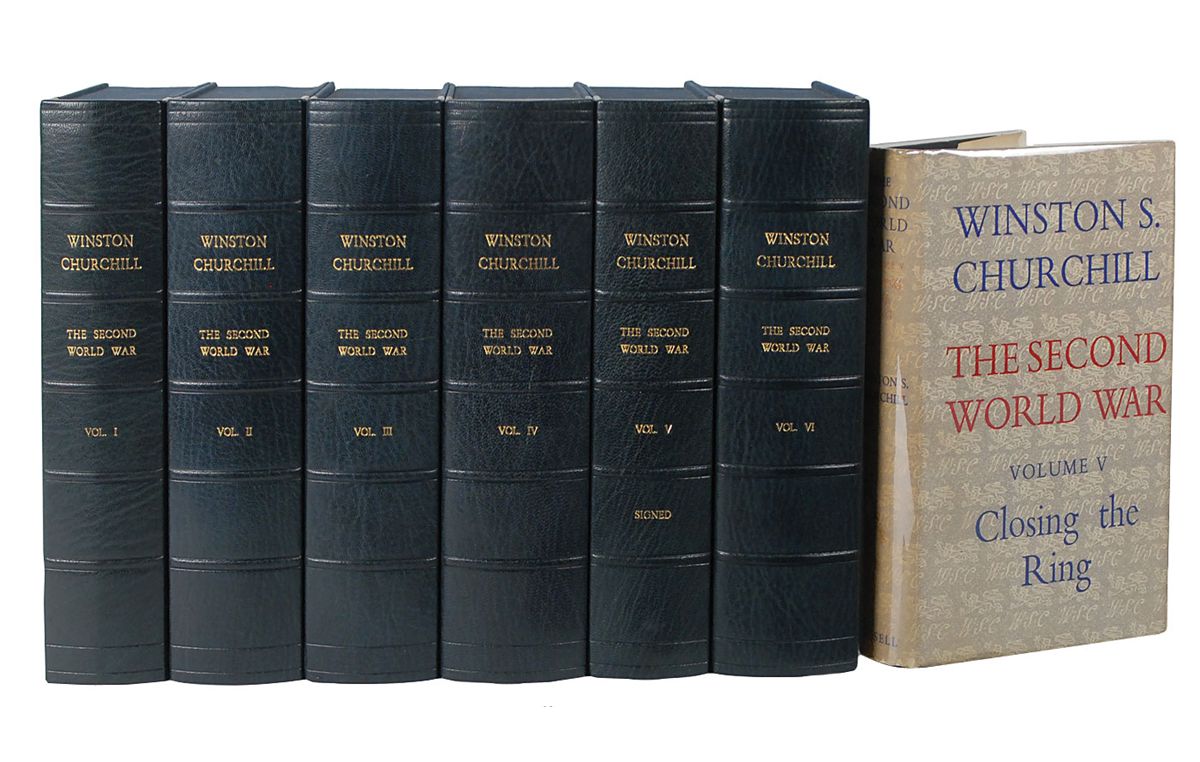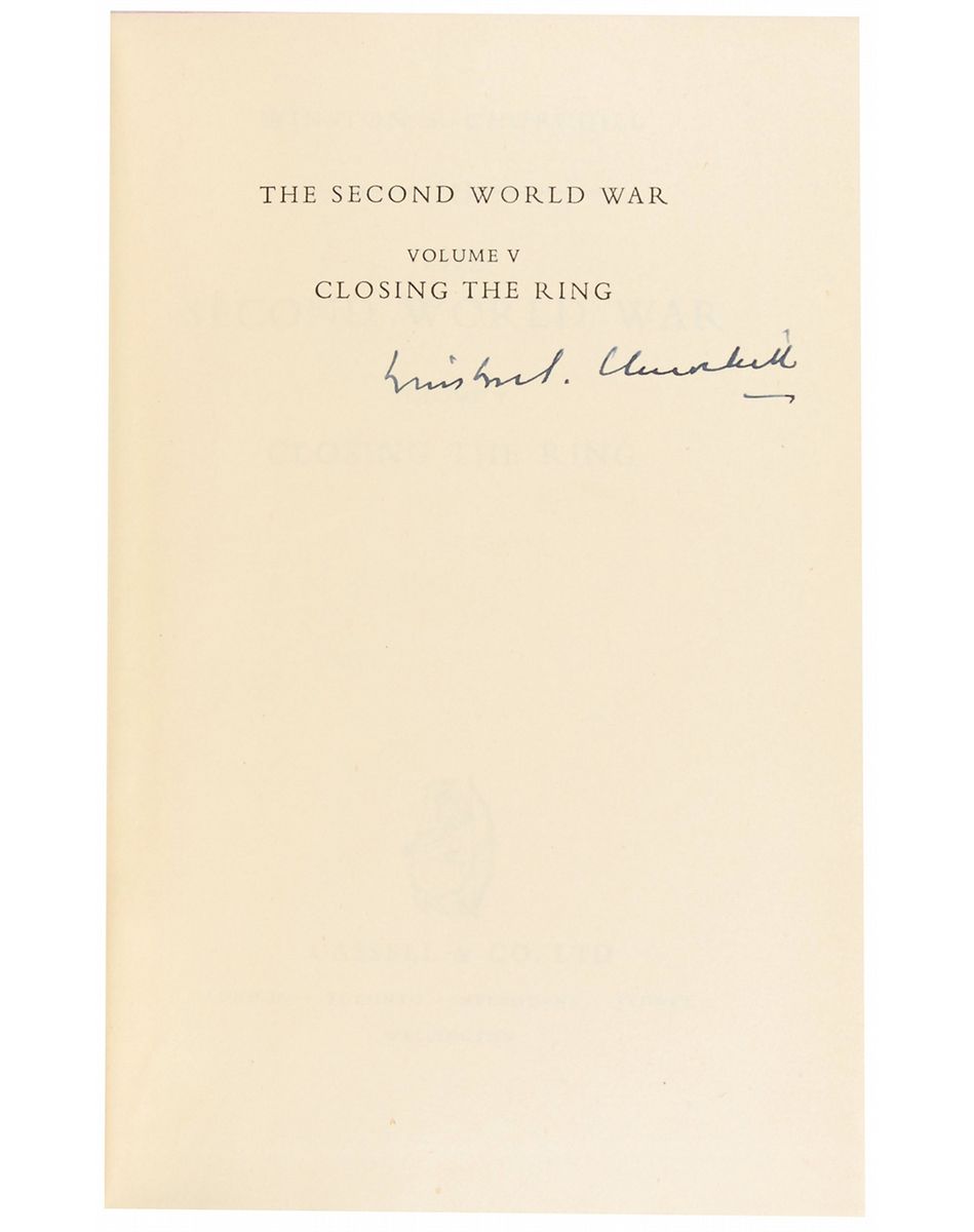 Complete book set: The Second World War, Volumes 1–6. London: Cassell and Co. Ltd., 1948–1954. Hardcovers with dust jackets, 6 x 8.5. Beautifully signed on the half-title page of the fifth volume in fountain pen, “Winston S. Churchill.” Each volume is housed in a custom gilt-stamped clamshell box. Autographic condition: fine. Book condition: signed volume, VG-/VG-; unsigned volumes, VG/VG-. As Britain’s prime minister for most of the Second World War, Winston Churchill had an unparalleled perspective on the conflict. After leaving office in 1945, he produced this remarkable account, which holds a very high place in the ranks of nonfiction books of the 20th century. The comprehensive series was a major success in both Great Britain and the United States, and was largely responsible for his being awarded the Nobel Prize for Literature in 1953.