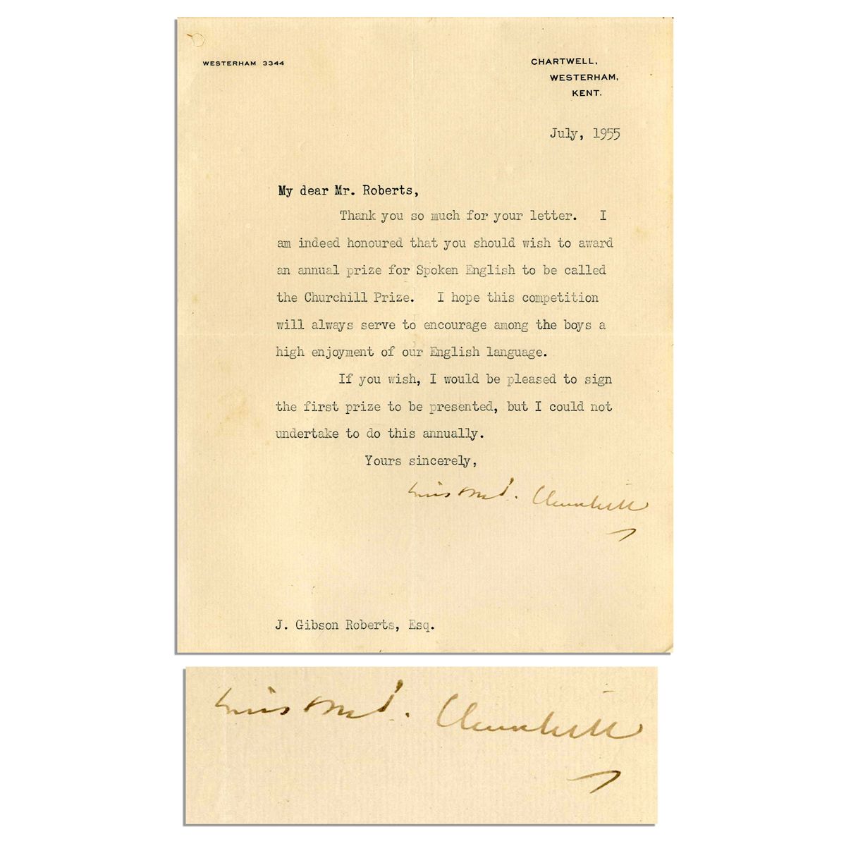 Winston Churchill typed letter signed. Dated July 1955, the year of his retirement as British Prime Minister, Churchill writes on Chartwell, Westerham, Kent stationery: ''...I hope this...will...encourage among the boys a high enjoyment of our English language...If you wish, I would be pleased to sign the first prize to be presented, but I could not undertake to do this annually...Winston Churchill''. Mounted to a pliable paper board. Toning, faint creasing and a miniscule tear to the right lower edge. Measures 7.25'' x 9''. Very good condition.