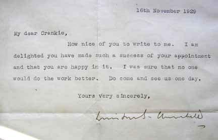 Winston Churchill typed letter signed to famed English cricketer Sir Eric Crankshaw. Written during Churchill's ''wilderness years'' dated 16 November 1929, letter reads in full, ''My dear Crankie, How nice of you to write to me. I am delighted you have made such a success of your appointment and that you are happy in it. I was sure that no one would do the work better. Do come and see us one day. Yours very sincerely.'' Letter measures 7.5'' x 6.5''. Full Churchill signature nicely penned. Mailing folds, otherwise very good condition.