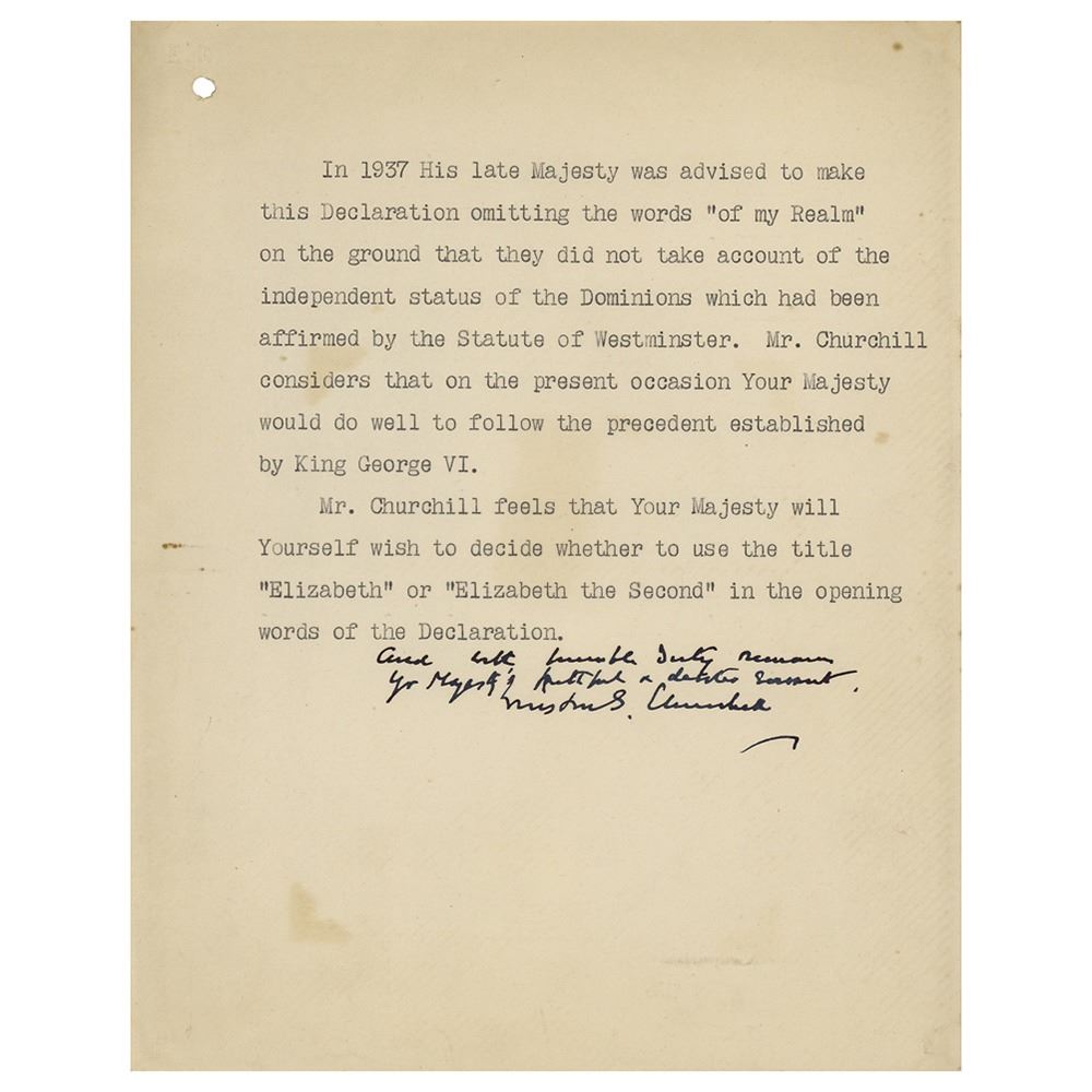 Third-person TLS from Prime Minister Winston Churchill to Elizabeth II prior to her accession to the throne on February 6, 1952, one page, 7.5 x 9.5, written on Queen Elizabeth’s embossed personal stationery. The letter, in full: “In 1937 His late Majesty was advised to make this Declaration omitting the words ‘of my Realm’ on the ground that they did not take account of the independent status of the Dominions which had been affirmed by the Statue of Westminster. Mr. Churchill considers that on the present occasion Your Majesty would do well to follow the precedent established by King George VI. Mr. Churchill feels that Your Majesty will Yourself wish to decide to use the title ‘Elizabeth’ or ‘Elizabeth the Second’ in the opening words of the Declaration.†Signed boldly at the conclusion by the prime minister, “And with humble duty remains, Yr Majesty’s faithful & devoted servant, Winston S. Churchill.†In very good to fine condition, with a few light stains, a single file hole, and a paperclip impression to the left edge.