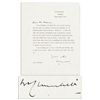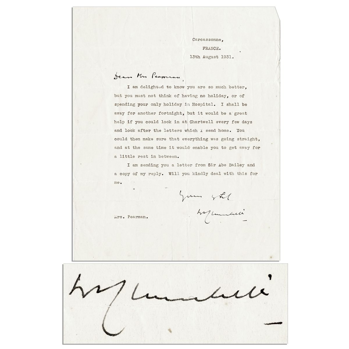 Winston Churchill typed letter signed to his secretary Mrs. Violet Pearman, dated 15 August 1931 during Churchill's political isolation following heavy Conservative party defeat in the House of Commons. Writing from France, Churchill adds a handwritten inscription at top, ''My Dear Mrs. Pearman'' and then continues in type, ''...it would be a great help if you could look in at Charterwell every few days...at the same time it would enable you to get away for a little rest in between...[signed] WS Churchill''. Single page measures 8'' x 10''. Very good condition.
