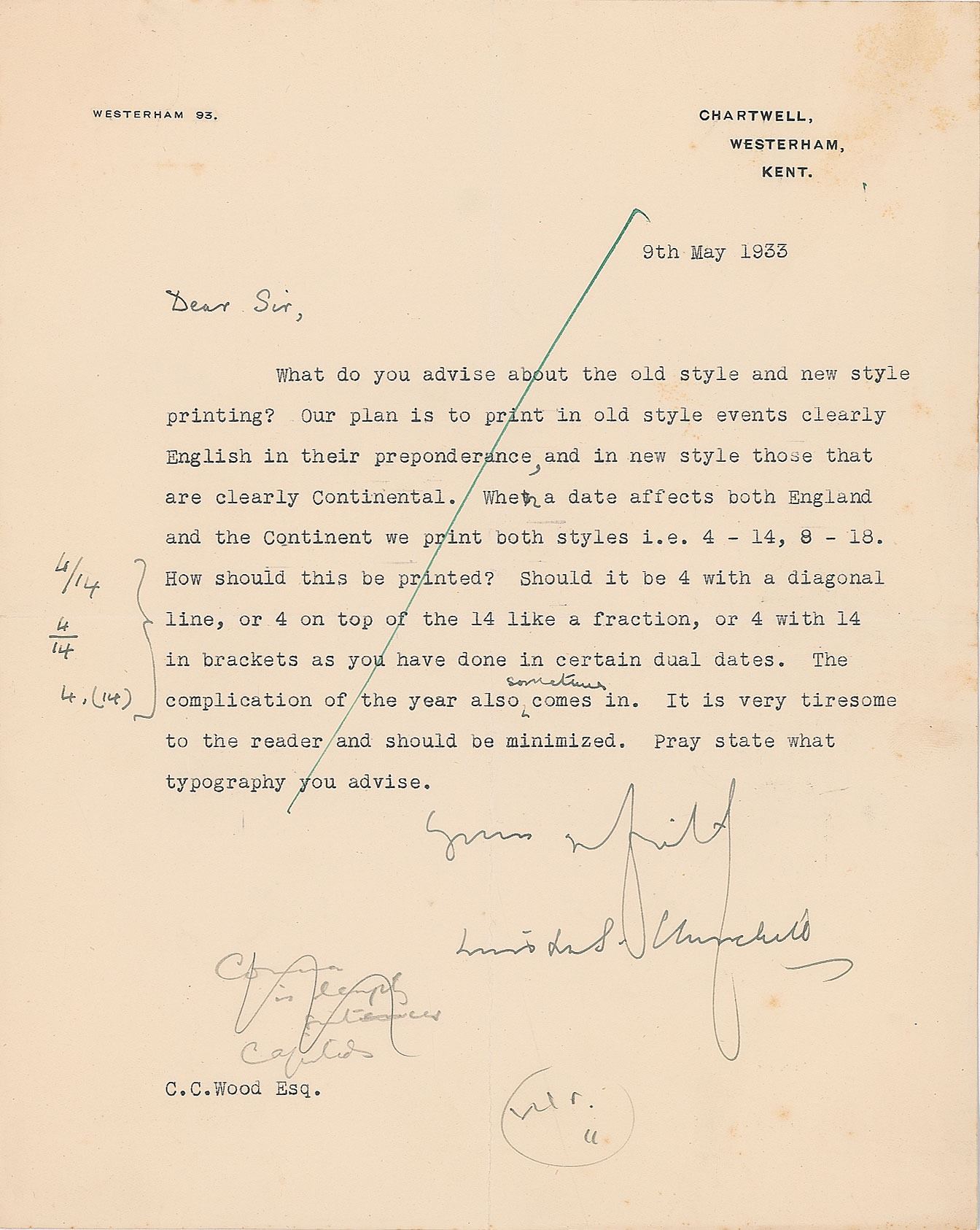 TLS signed “Winston S. Churchill,” 8 x 10, Chartwell letterhead, May 9, 1933. Letter to his proofreader and editor C. C. Wood relating to the publication of the monumental biography Marlborough: His Life and Times. In full: "What do you advise about the old style and new style printing? Our plan is to print in old style events clearly English in their preponderance, and in new style those that are clearly Continental. When a date affects both England and the Continent we print both styles i.e. 4-14, 8-19. How should this be printed? Should it be 4 with a diagonal line, or 4 on top of the 14 like a fraction, or 4 with 14 in brackets as you have done in certain dual dates. The complication of the year also sometimes comes in. It is very tiresome to the reader and should be minimized. Pray state what typography you advise." Churchill sketches the three styles in the left margin as examples. In fine condition, with some light soiling to the right edge.