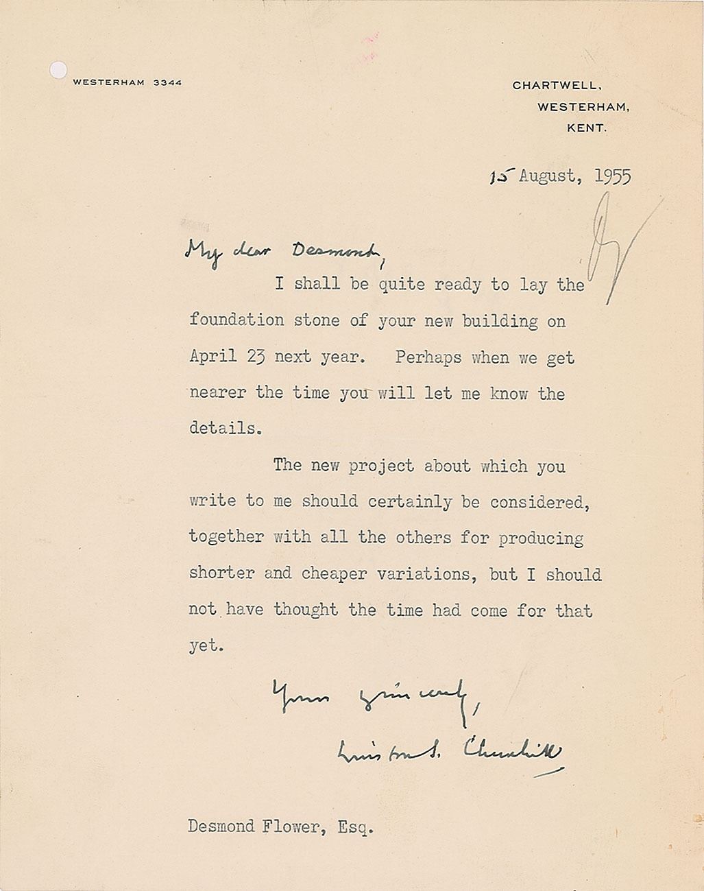TLS signed “Yours sincerely, Winston S. Churchill,” one page, 7.5 x 9.5, Chartwell, Westerham, Kent letterhead, August 15, 1955. Letter to editor and publisher Desmond Flower, in full: "I shall be quite ready to lay the foundation stone of your new building on April 23 next year. Perhaps when we get nearer the time you will let me know the details. The new project about which you write to me should certainly be considered, together with all the others for producing shorter and cheaper variations, but I should not have thought the time had come for that yet." Churchill adds the salutation in his own hand. In fine condition. Desmond Flower (1907–1997) was the longtime editor and director at London's Cassell & Co., a publishing house that released numerous collected speeches by Churchill, in addition to two of his most enduring works: the six-volume The Second World War, and the four-volume A History of the English-Speaking Peoples.