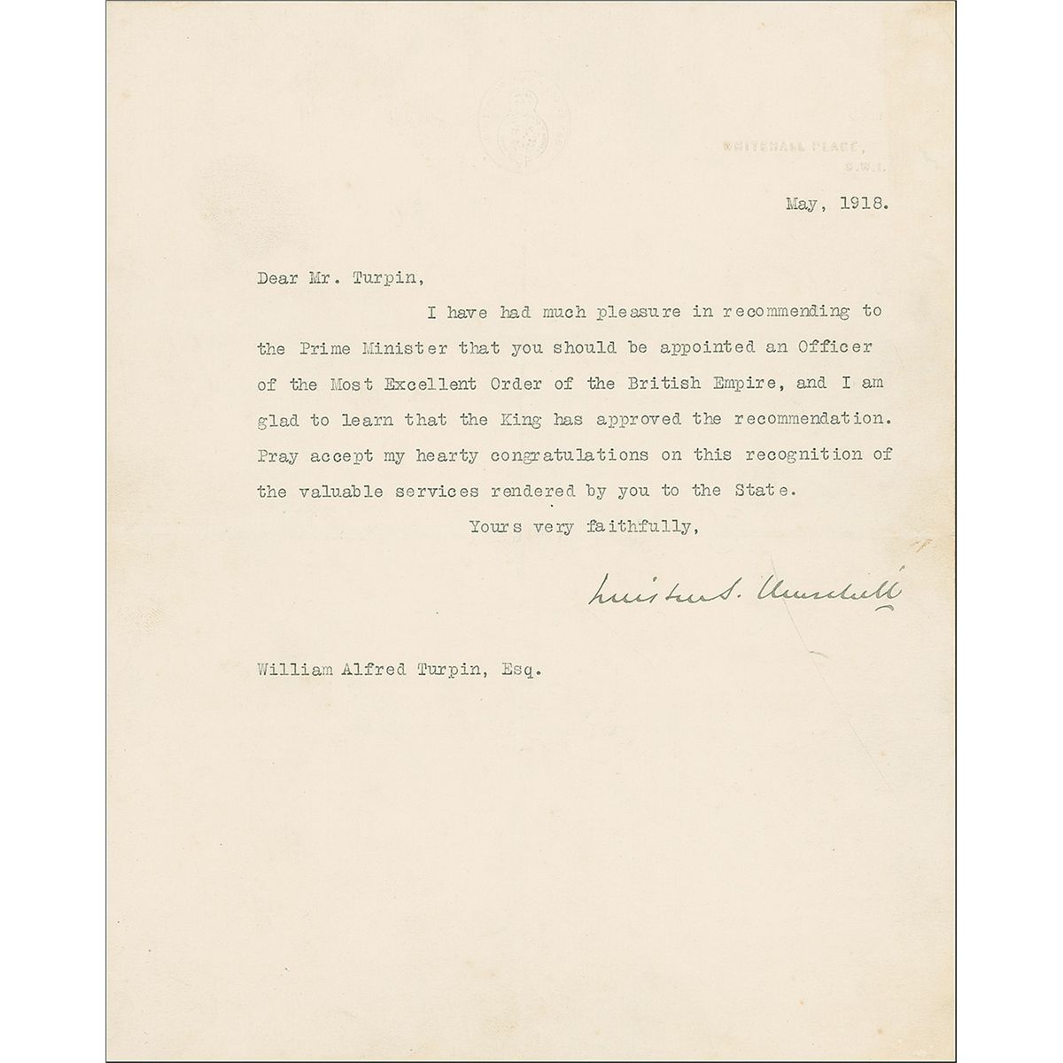 War-dated TLS, signed “Winston S. Churchill,” one page, 8 x 10, Ministry of the Munitions of War letterhead, dated May, 1918. Letter to William Alfred Turpin, Esq. In full, “I have had much pleasure in recommending to the Prime Minister that you should be appointed an Officer of the Most Excellent Order of the British Empire, and I am glad to learn that the King has approved the recommendation. Pray accept my hearty congratulations on this recognition of the valuable services rendered by you to the State.”