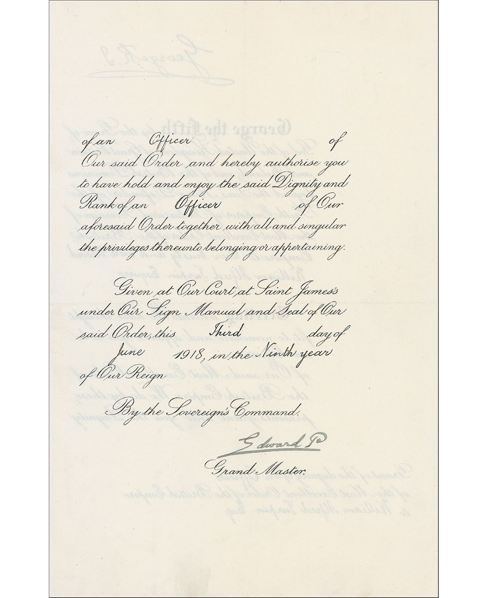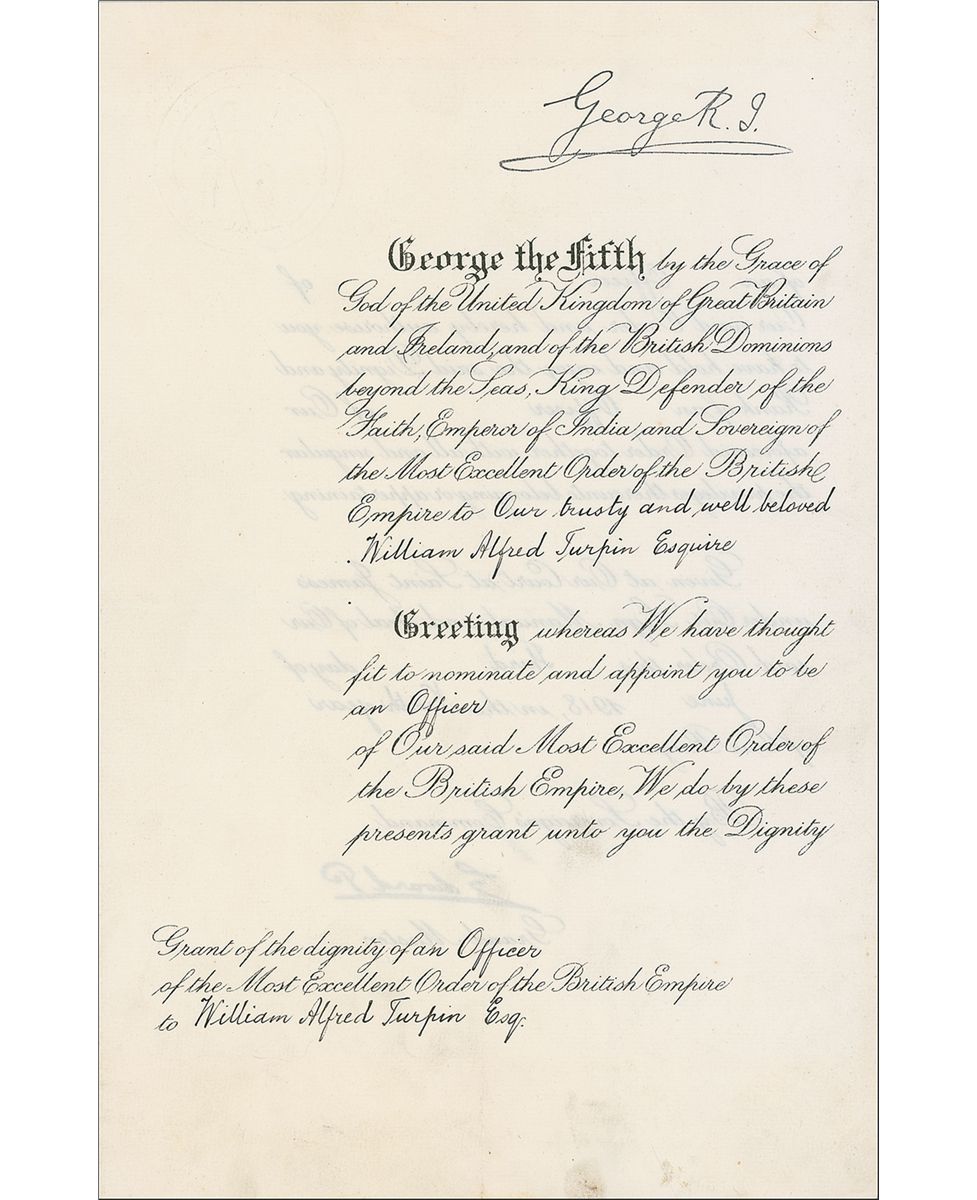 A partly printed document, signed “Edward P,” as Grand Master, one page, both sides, dated June 3, 1918, presented to Turpin. In part: “Greeting whereas We have thought fit to nominate and appoint you to be an Officer of Our said Most Excellent Order of the British Empire, We do by these presents grant unto you the Dignity of an Officer of Our said Order and hereby authorize you to have hold and enjoy the said Dignity and Rank of an Officer of Our aforesaid Order together with all and singular the privileges thereunto belonging or appertaining.”