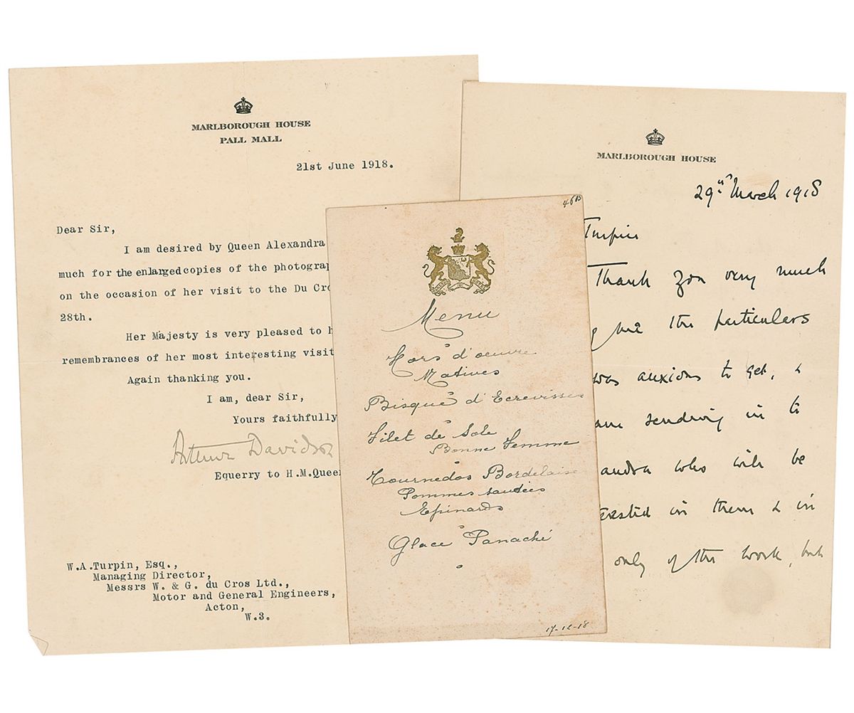 Also included is his obituary in the Belfast Telegraph; an ALS and TLS signed “Arthur Davidson” as Equerry to H. M. Queen Alexandra (mother of King George V) each dated 1918; an article about Queen Alexandra’s 1918 visit to the W. & G. Du Cros munitions factory; a handwritten 4.25 x 7.5 menu dated December 17, 1918 signed in pencil on verso “W. A. Turpin,” “Molly Turpin,” “Harvey du Cros Jun.,” “Billy du Cros,” and “Betty du Cros”; two 11.5 x 8.5 photographs of W&G du Cros motor vehicles; three photographs of trophies presented to Turpin by five members of the du Cros family and by the employees and staff of W. & G. du Cros Ltd. In very good overall condition.