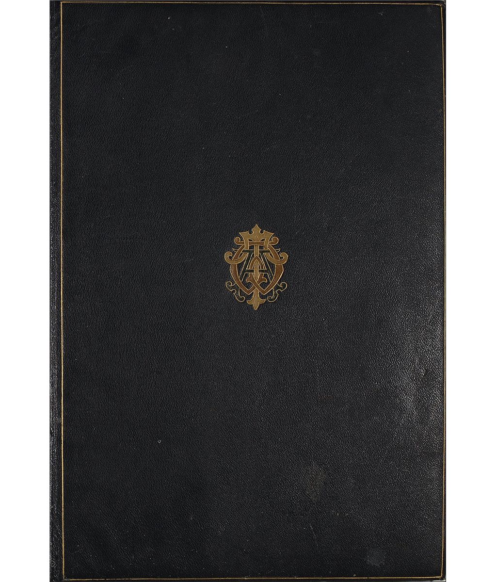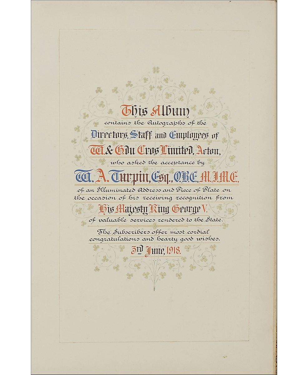 A testimonial album, 34 pages,12.5 x 18.75, front and verso, presented to W. A. Turpin “on the occasion of his receiving recognition from His Majesty King George V of valuable services rendered to the State. The Subscribers offer most cordial congratulations and hearty good wishes. 3rd June, 1918.” The gilt-edged, ornately bordered heavy card-weight pages are signed by over 2,000 men and women employed in the various divisions of W. & G. Du Cros beginning with five members of the du Cros family, the directors of the company. Exquisitely bound in black morocco boards with Turpin’s monogram on the cover.