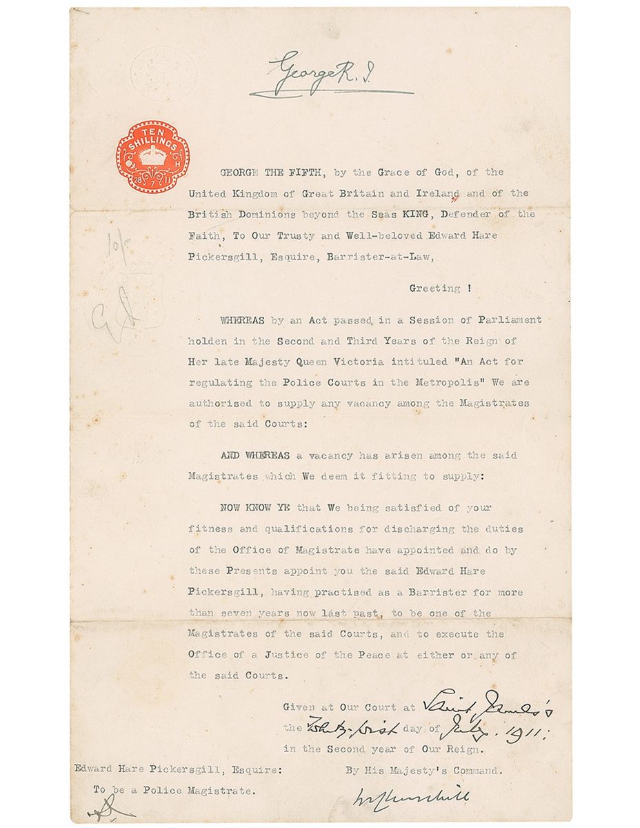 DS, signed “W. S. Churchill” and “George R.I.,” one page, 8 x 12.75, July 21, 1911. King George appoints Edward Hare Pickersgill “being satisfied of your fitness and qualifications for discharging the duties of the Office of Magistrate have appointed and do by these Presents appoint you the said Edward Hare Pickersgill to be one of the Magistrates of the said Courts.” Signed at the conclusion by Churchill and signed along the top by King George. In very good condition, with scattered light toning, soiling, and foxing and three horizontal folds. Accompanied by two other letters, one appointing Pickersgill to the Greenwich and Woolwich Police Courts, the other making him Steward of Northstead. A rare combination of two powerful statesmen, with George signing just a month after his coronation.