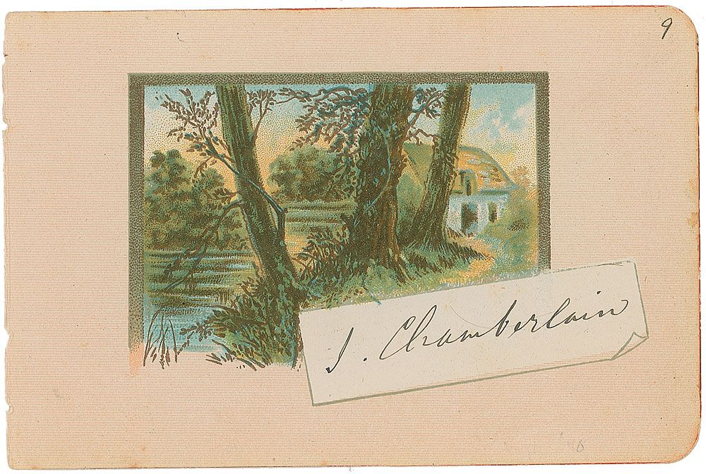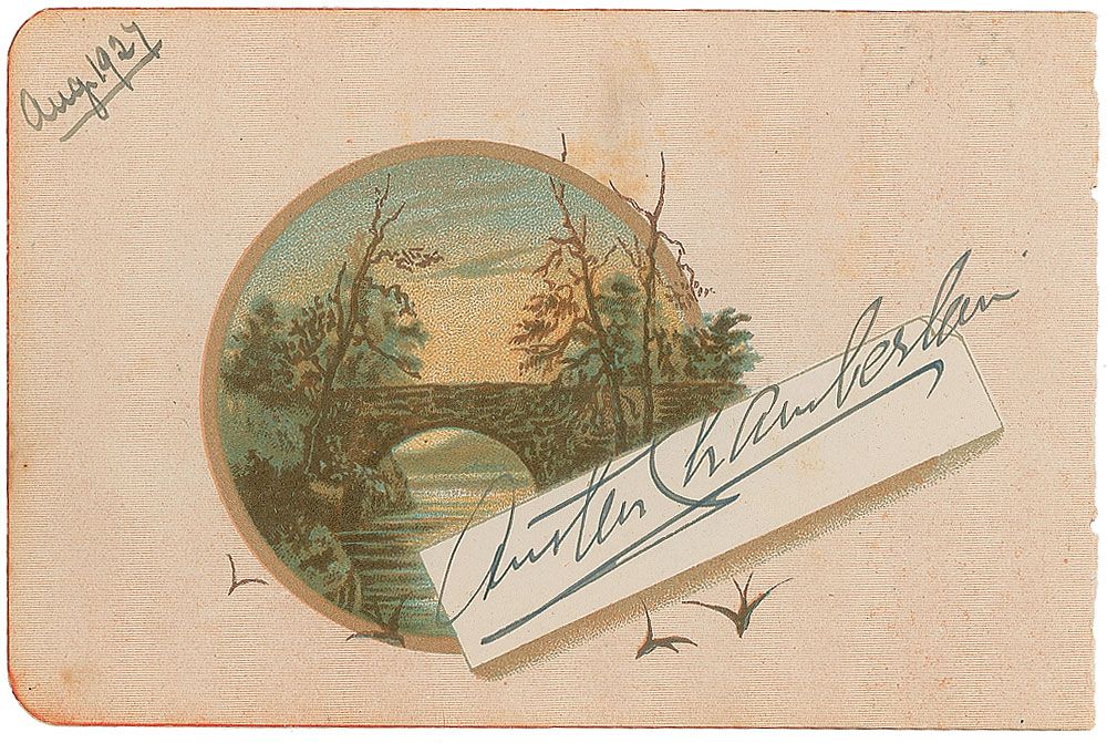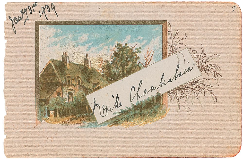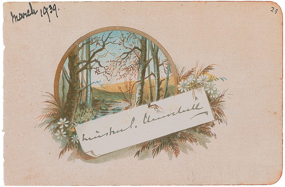 Vintage fountain pen signatures, “Winston S. Churchill” and “Neville Chamberlain” on individual fancy illustrated 5.25 x 3.25 album pages, with collector’s notations to the top left corners. Accompanied by two more similar album pages signed by Joseph Chamberlain, William Harcourt, and Austen Chamberlain. Accompanied by an October 11, 1939, TLS from Churchill’s private secretary, sending along a message of good wishes for the recipient’s future publication. In fine condition.