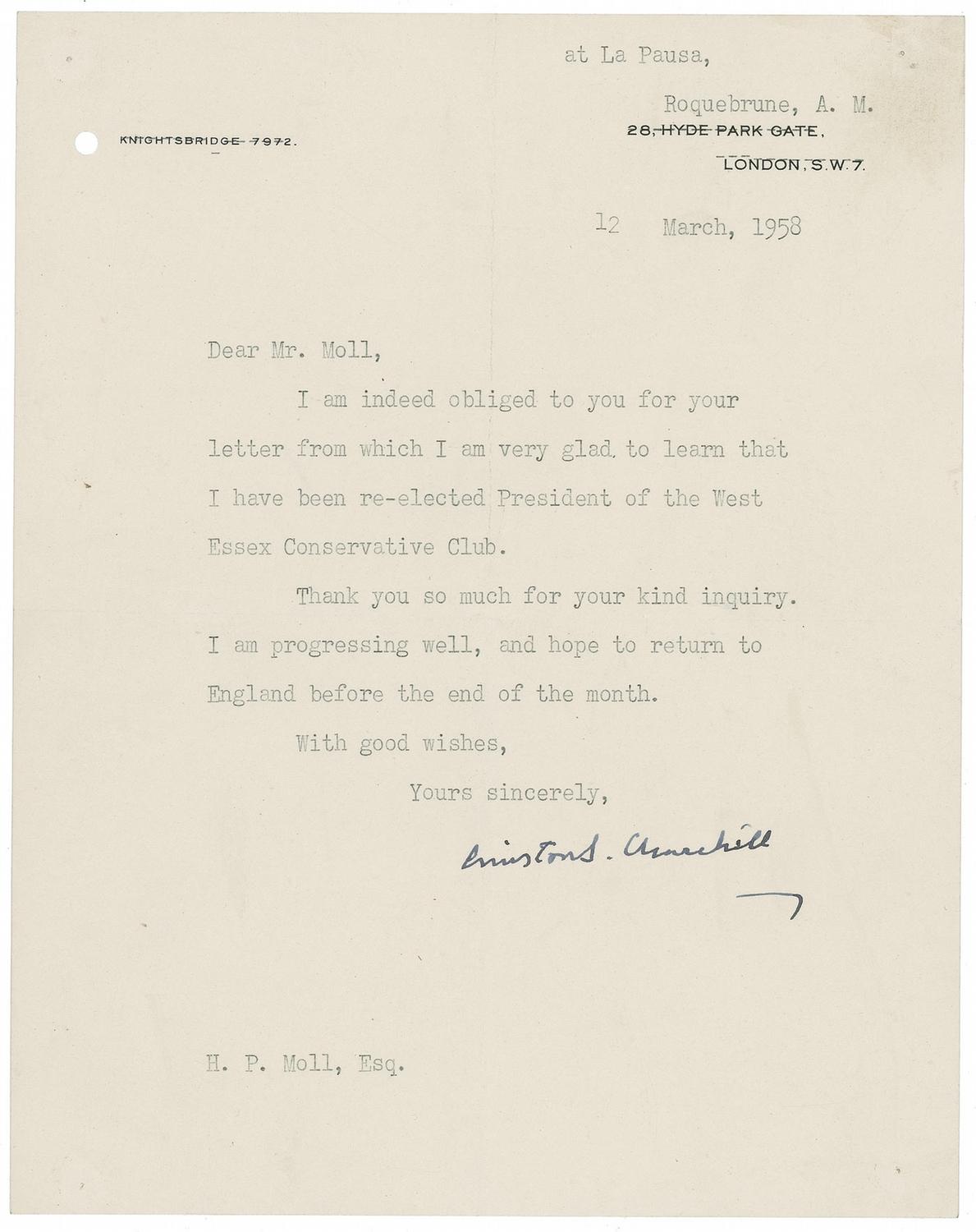 TLS, one page, 7.5 x 9.5, typed La Pausa letterhead, March 12, 1958. Letter of thanks to H. P. Moll. In full: “I am indeed obliged to you for your letter from which I am very glad to learn that I have been re-elected President of the West Essex Conservative Club. Thank you so much for your kind inquiry. I am progressing well, and hope to return to England before the end of the month." Central horizontal and vertical fold, with vertical fold through single letter of signature, punch and staple hole to top corners, and some scattered light soiling, otherwise fine condition. After retiring from office, Churchill stayed eleven times with Emery and Wendy Reves at their villa, La Pausa, at Roquebrune in the South of France between January 1956 and April 1959. He considered his stays there among the most enjoyable times of his life.