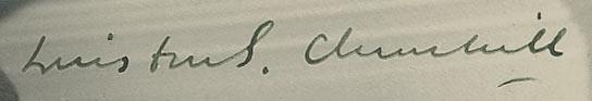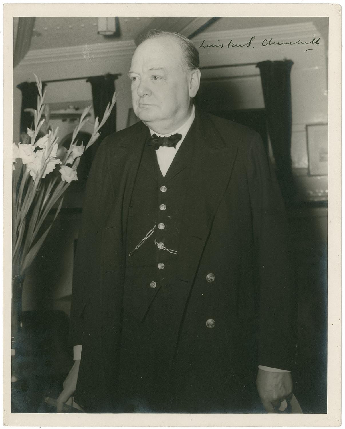 Exceptional vintage matte-finish 8 x 10 official Royal Canadian Navy photo of Churchill in a three-piece suit, signed in fountain pen, “Winston S. Churchill.” In fine condition, with some mild silvering to edges and darker ports of image and a few trivial edge and corner tip dings. A handsome image, not commonly seen in portraits of this size.