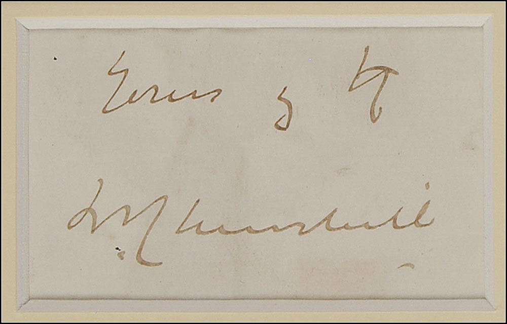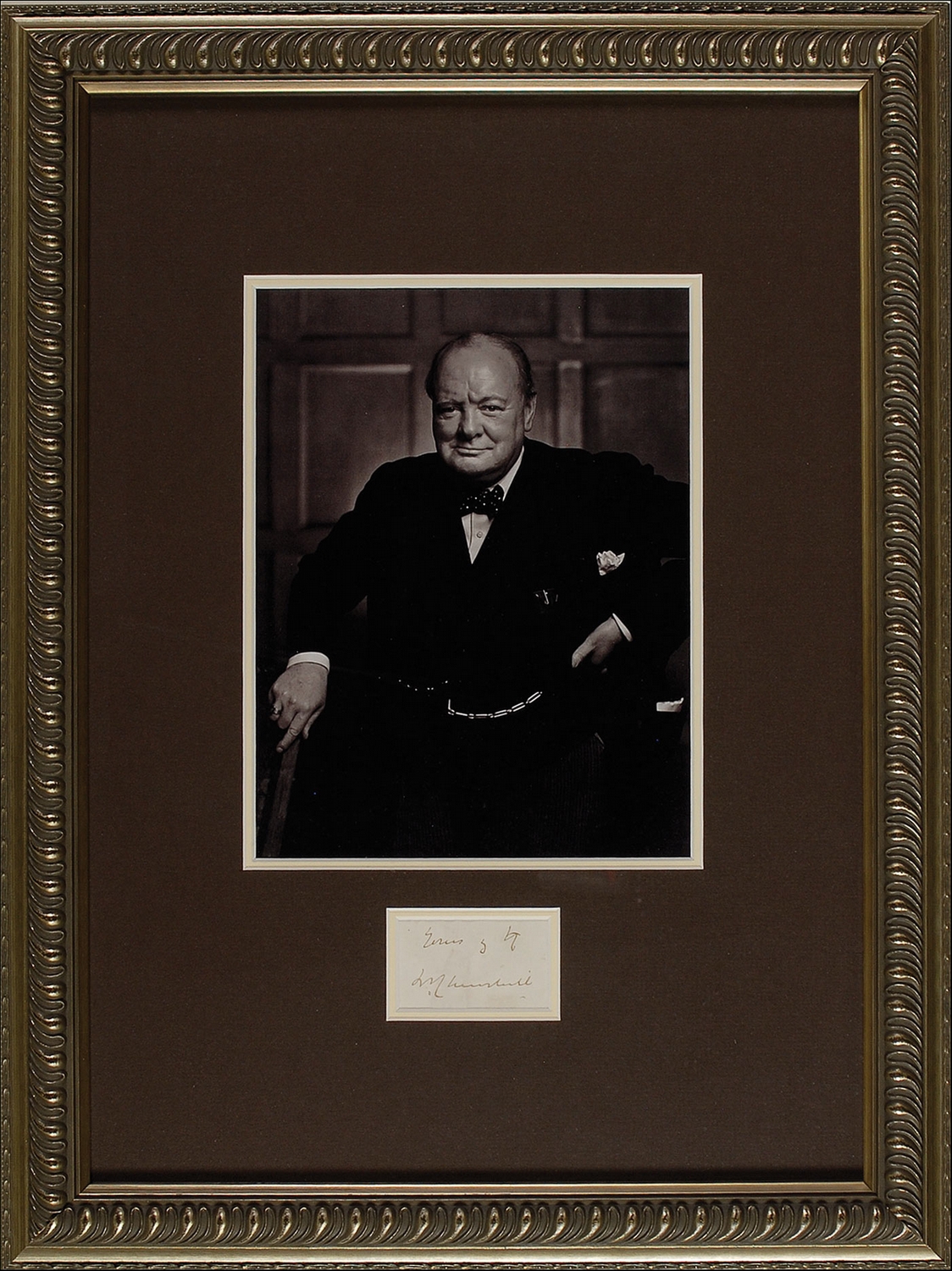 Fountain pen signature, “Yours very truly, W. Churchill,” on an off-white slip. Double matted and framed with a portrait of Churchill, to an overall size of 16 x 21. Some light wrinkles and creases, and some scattered light soiling, otherwise fine condition.