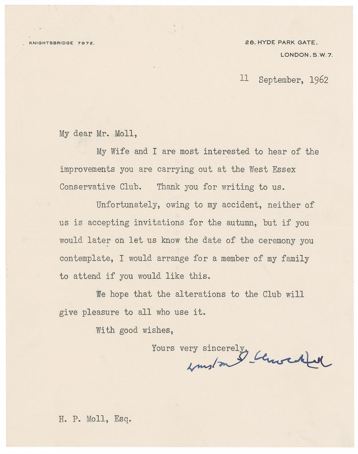 TLS signed “Winston S. Churchill,” one page, 7.5 x 9.5, personal letterhead, September 11, 1962. Churchill declines an invitation. In full: “My wife and I are most interested to hear of the improvements you are carrying out at the West Essex Conservative Club. Thank you for writing to us. Unfortunately, owing to my accident, neither of us is accepting invitations for the autumn, but if you would later on let us know the date of the ceremony you contemplate, I would arrange for a member of my family to attend if you would like this. We hope that the alterations to the Club will give pleasure to all who use it.” In fine condition, with central horizontal and vertical fold and a couple staple holes to top edge. The injuries sustained after falling out of bed while in Monte Carlo began a slow but steady decline in Churchill’s health, leading to his gradual withdrawal from public life until his death on January 24, 1965.