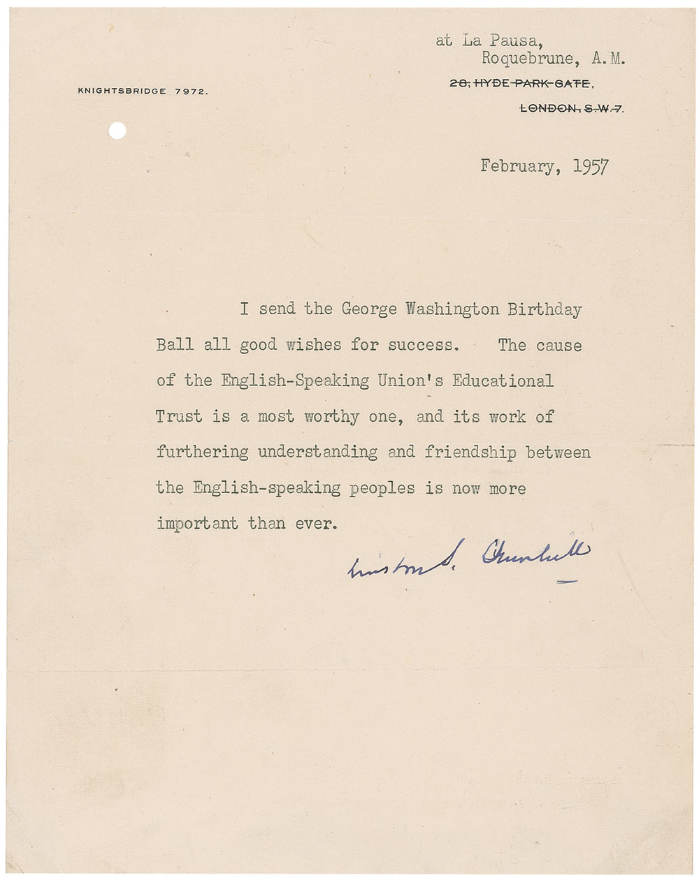 Typed statement, signed “Winston S. Churchill,” one page, 7.25 x 9.5, dated February 1957. From La Pausa, Roquebrune, Churchill issues a statement. In full: “I send the George Washington Birthday ball all good wishes for success. The cause of the English-Speaking Union’s Educational Trust is a most worthy one, and its work of furthering understanding and friendship between the English-speaking peoples is now more important than ever.” Small separation along one of the horizontal folds, a punch hole to top left and some scattered light creasing and soiling, otherwise fine condition.