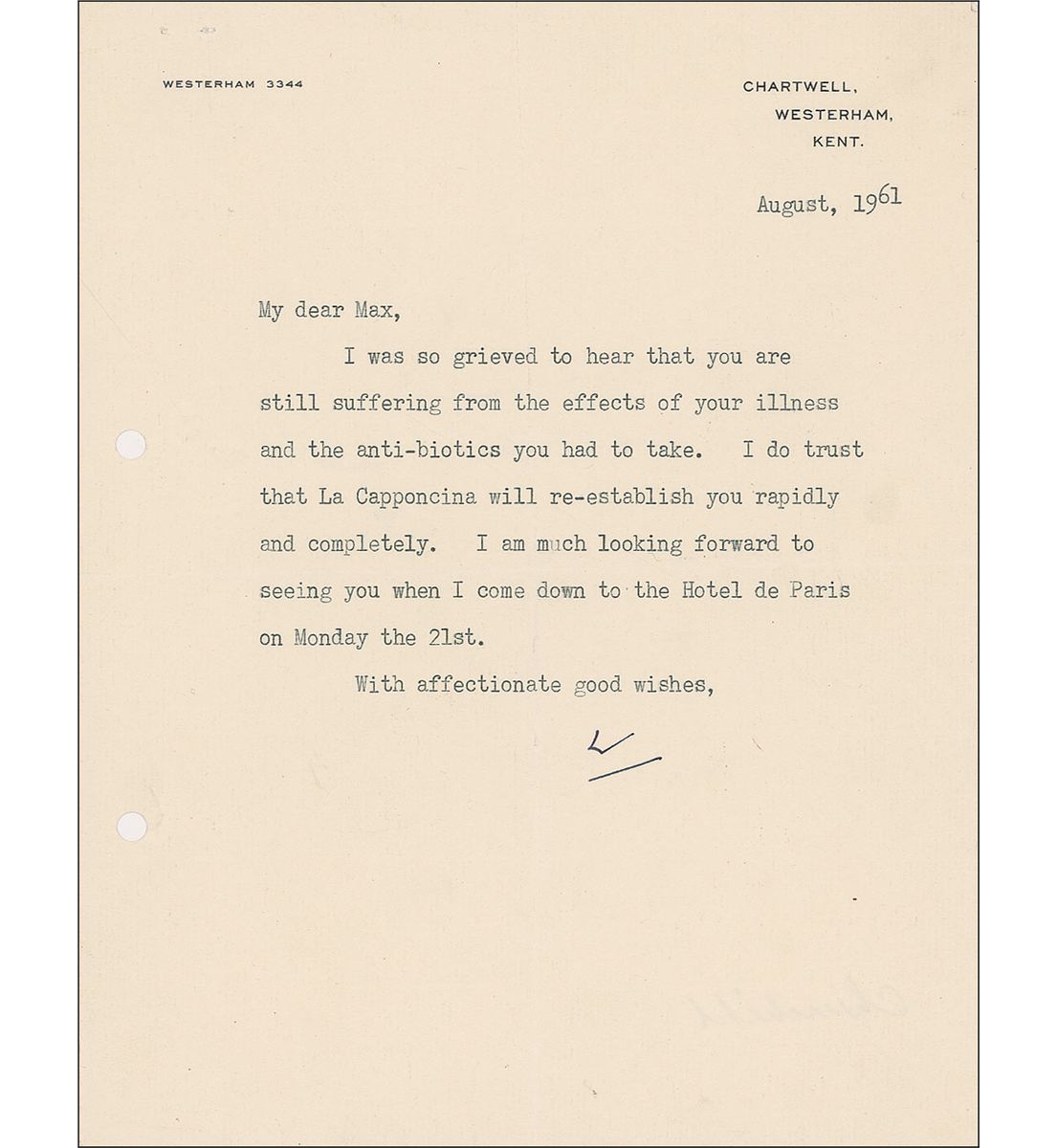 Crisp TLS signed “W.,” one page, 7.5 x 9.5, Chartwell, Westerham, Kent letterhead, August 1961. Churchill writes to his friend Max, in full: “I was so grieved to hear that you are still suffering from the effects of your illness and the anti-biotics you had to take. I do trust that La Capponcina will re-establish you rapidly and completely. I am much looking forward to seeing you when I come down to the Hotel de Paris on Monday the 21st.” A central horizontal and vertical fold, a small staple mark to the top left corner, and two punch holes to the left edge, otherwise fine condition.