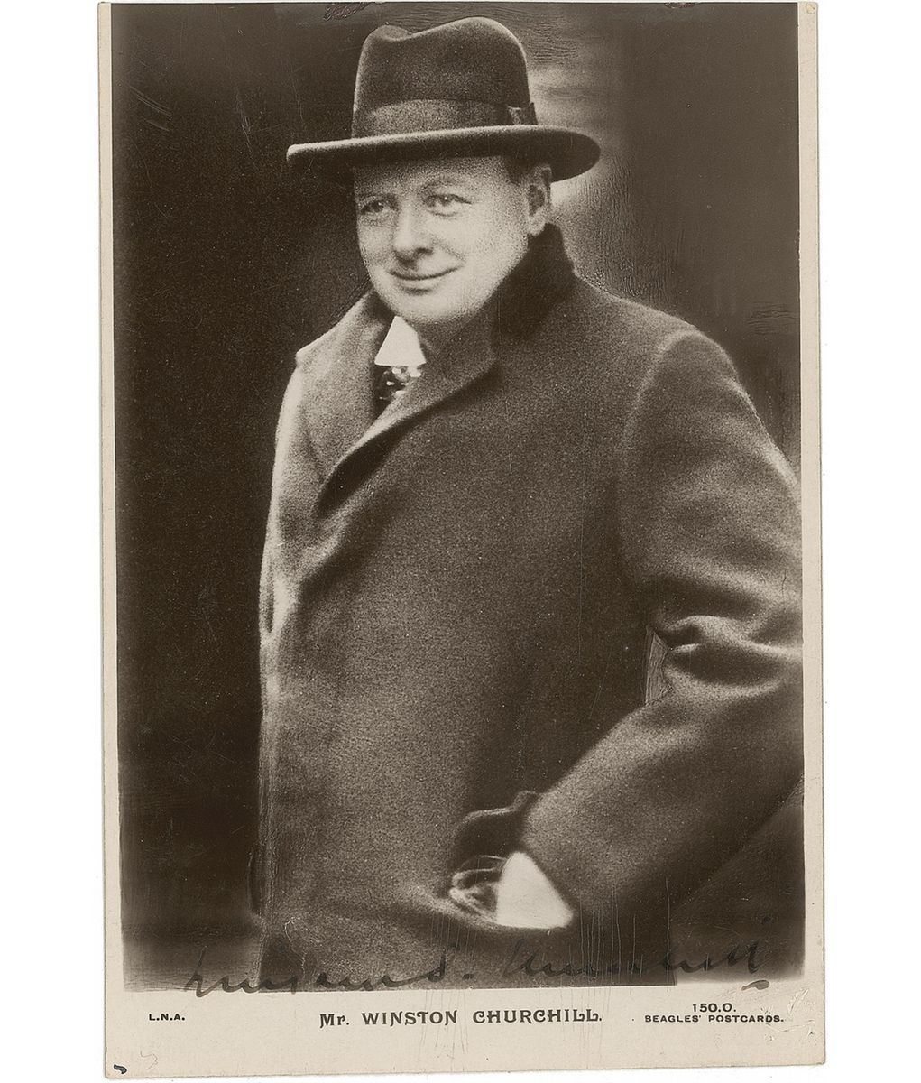 Vintage glossy 3.5 x 5 J. Beagles’ postcard photo of a young Churchill outside in a hat and overcoat, circa 1910, signed along the bottom in fountain pen, “Winston S. Churchill.” In very good condition, with trimmed top edge, paperclip impression along top edge, some light vertical creases, and a bit of light contrast to portion of signature. A particularly early photo of the vibrant man who helped direct and shape the course of history.