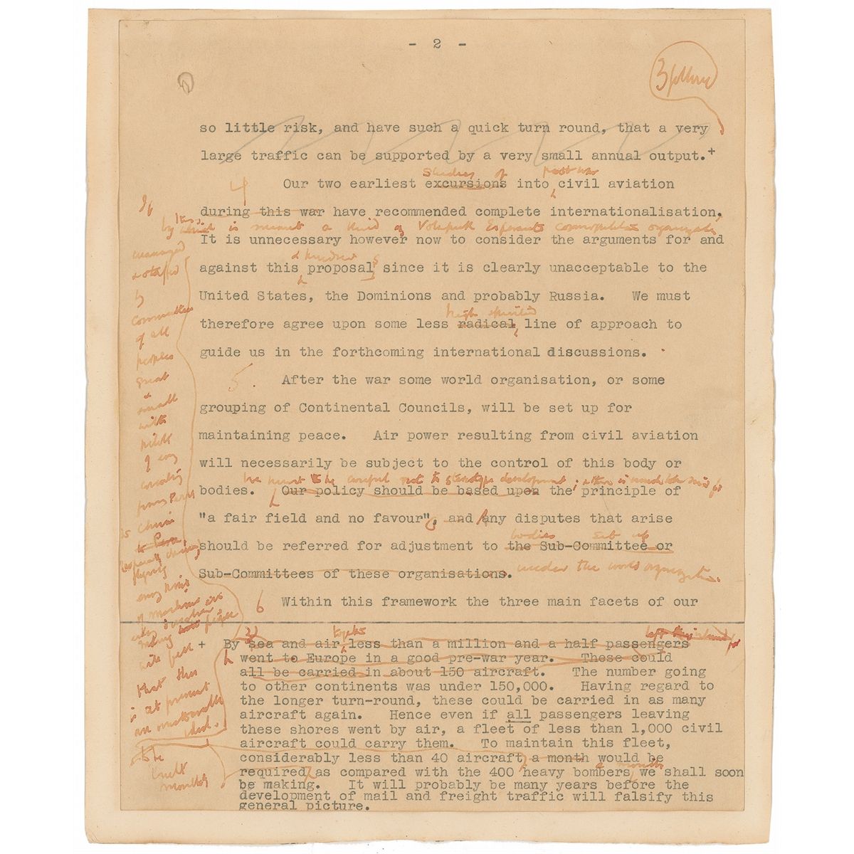 + Footnote, corrected in red ink by Churchill: “The number going to other continents was under 150,000. Having regard to the longer turn-round, these could be carried in as many aircraft again. Hence even if all passengers leaving these shores went by air, a fleet of less than 1,000 civil aircraft could carry them. To maintain this fleet, considerably less than 40 aircraft would be required to be built monthly as compared with the 400 heavy bombers monthly we shall soon be making. It will probably be many years before the development of mail and freight traffic will falsify this general picture.” Page is affixed to a slightly larger off-white sheet. In very good to fine condition, with all ink of Churchill’s notations lightly faded, but still legible, punch hole to top left, and a uniform shade of mild toning.