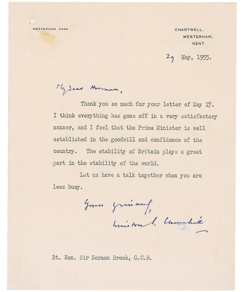TLS signed “Yours cordially, Winston S. Churchill,” one page, 7.5 x 9.5, Chartwell, Westerham, Kent letterhead, May 29, 1955. Letter to Sir Norman Brook, addressed at the top by Churchill, “My dear Norman.” In full: “Thank you so much for your letter of May 27. I think everything has gone off in a very satisfactory manner, and I feel that the Prime Minister is well established in the goodwill and confidence of the country. The stability of Britain plays a great part in the stability of the world. Let us have a talk together when you are less busy.” Letter is affixed to an identical size sheet. In very good condition, with central horizontal and vertical fold, one through a single letter of signature, small brush and spot to last name of signature, a bit of light soiling, some rippling and creasing from adhesive, and a punch hole to top left.