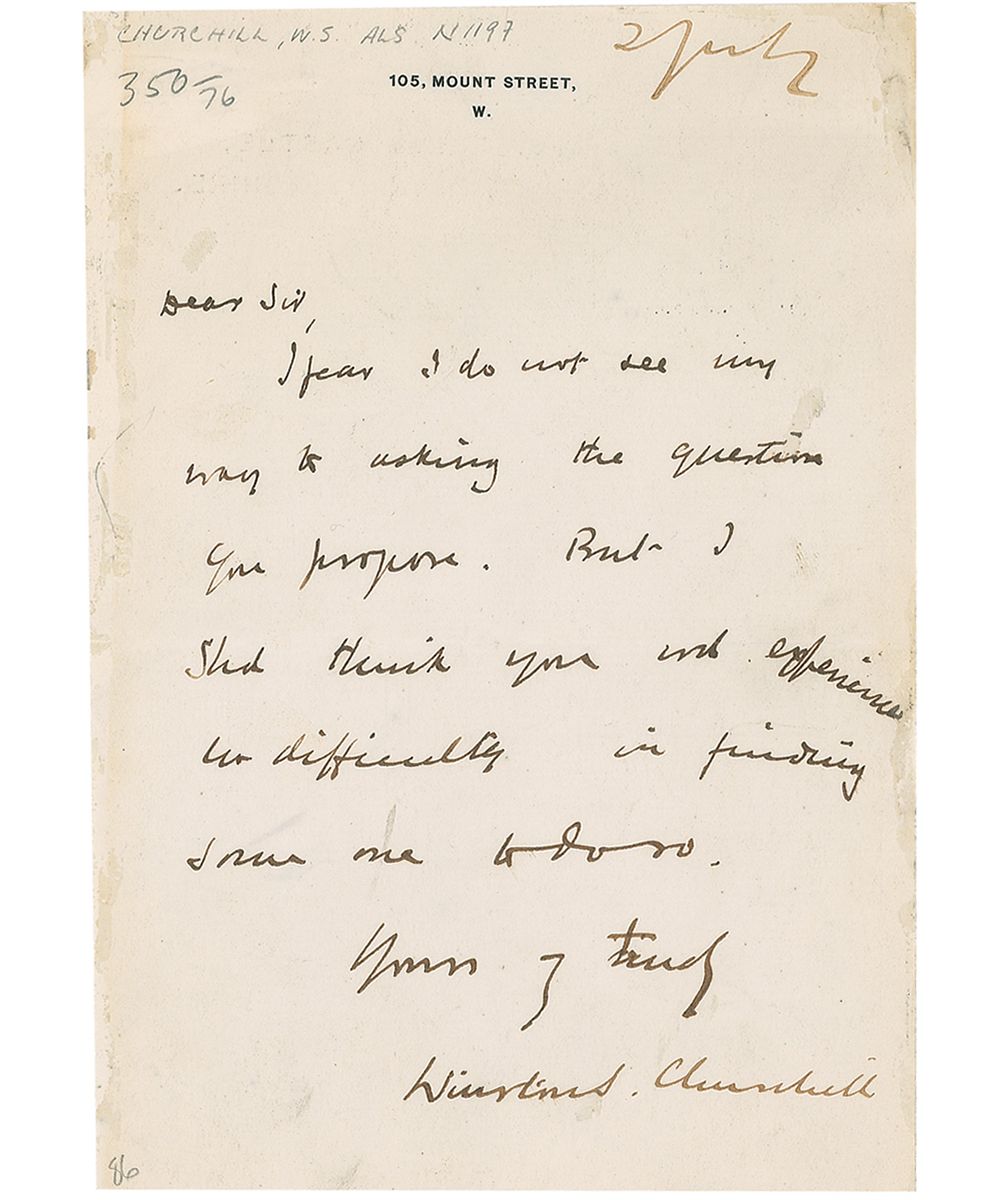 ALS signed “Winston S. Churchill,” one page, 4.5 x 6.75, 105 Mount Street letterhead, no date. Letter to an unidentified gentleman. In full: “I fear I do not see my way to asking the question you propose. But I shd think you wd. experience no difficulty in finding some one to do so.” In very good condition, with scattered toning and soiling, adhesive remnants to edges, and several pencil notations.