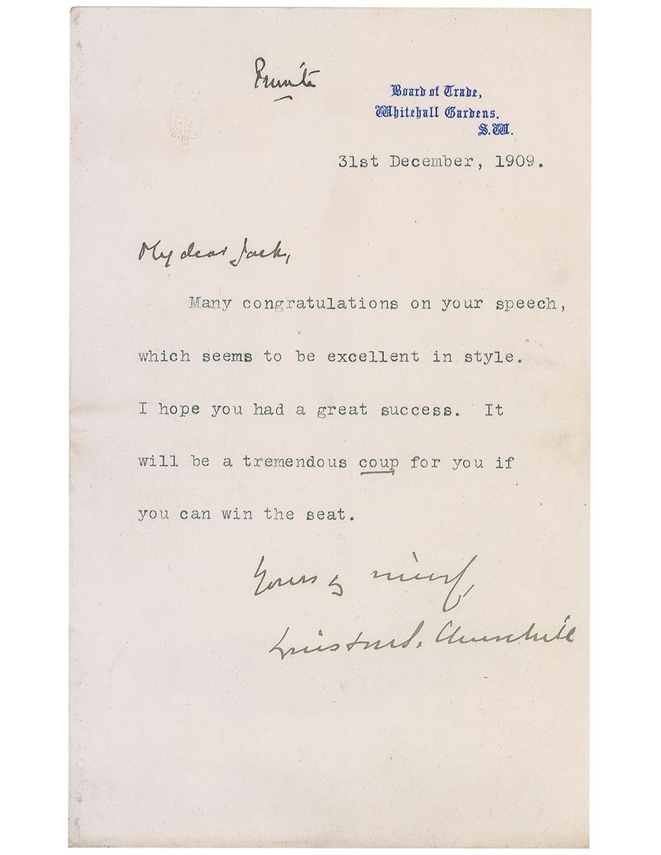 TLS signed “Winston S. Churchill,” one page, 5 x 8, Board of Trade letterhead, December 31, 1909. Letter, marked at the top by Churchill “Private,” and addressed in his hand to his brother, “My dear Jack.” In full: “Many congratulations on your speech, which seems to be excellent in style. I hope you had a great success. It will be a tremendous coup for you if you can win the seat.” Churchill also adds, “Yours sincerely,” before his signature. In very good condition, with scattered creasing and wrinkling from mounting remnants on reverse, a bit of light toning and soiling, and a couple surface impressions.