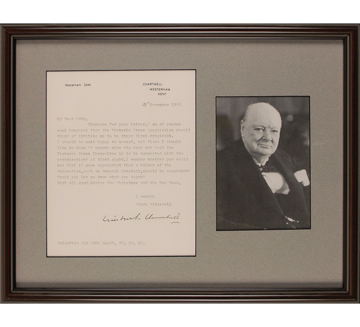 TLS signed “Winston S. Churchill,” one page, 6.25 x 8, Chartwell letterhead, November 24, 1958. Letter to Brigadier Sir John Smyth. In part: “I am of course most honoured that the Victoria Cross Association should think of inviting me to be their first President. I should be most happy to accept, but first I should like to know if anyone else who does not hold the Victoria Cross themselves is to be connected with the organisation? At first sight, I wonder whether you would not feel it more appropriate that a holder of the decoration, such as General Freyberg, should be president?” Matted and framed with a portrait of Churchill to an overall size of 15.25 x 12. In fine condition. The Victoria Cross Association was formed in 1956, with Churchill agreeing to serve as President, and Sir John Smyth as Chairman. Churchill was recommended for the Victoria Cross several times over the course of his military career, but was never awarded it.