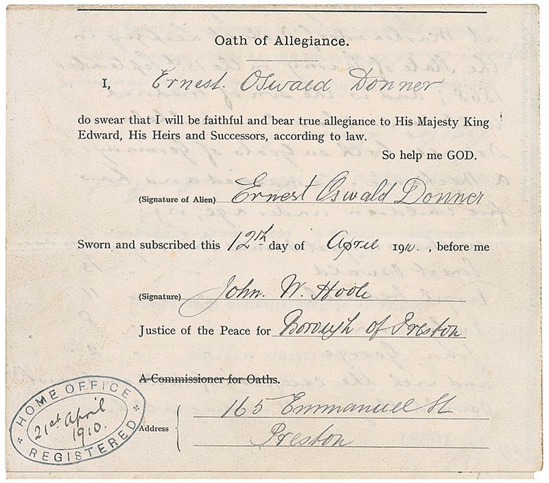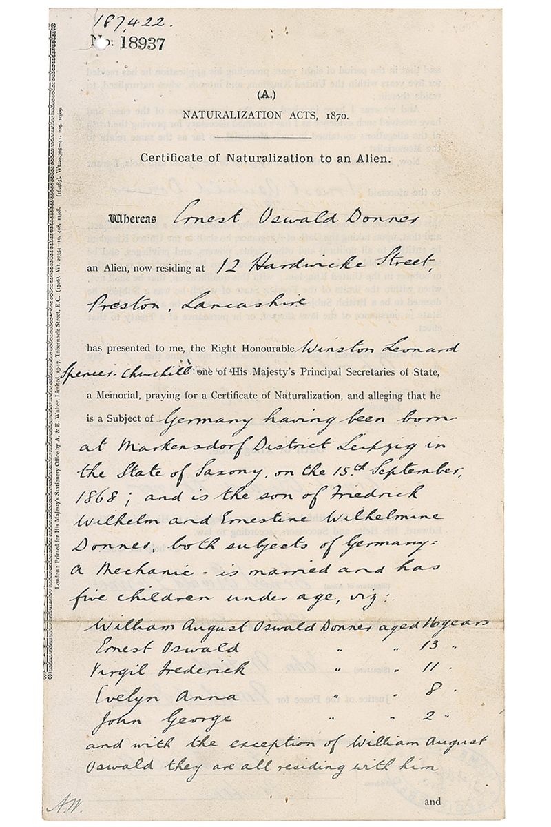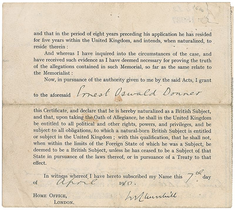 Partly-printed DS, signed “W. S. Churchill,” one page both sides, 7.25 x 13, April 7, 1910. Naturalization Certificate for Ernest Oswald Donner, a German National, listing his lineage, his occupation, and the names and ages of his five children, signed on the reverse by Churchill. Reverse also bears Donner’s signed oath of Allegiance. In very good condition, with intersecting folds, scattered toning and soiling, heavier to upper portion, repaired punch hole and tear to top left corner, and a couple ink notations.