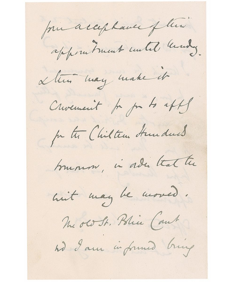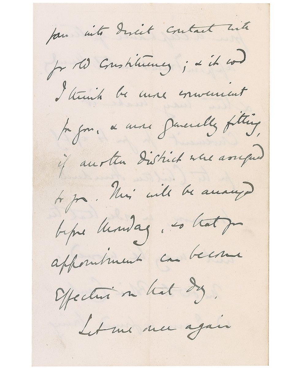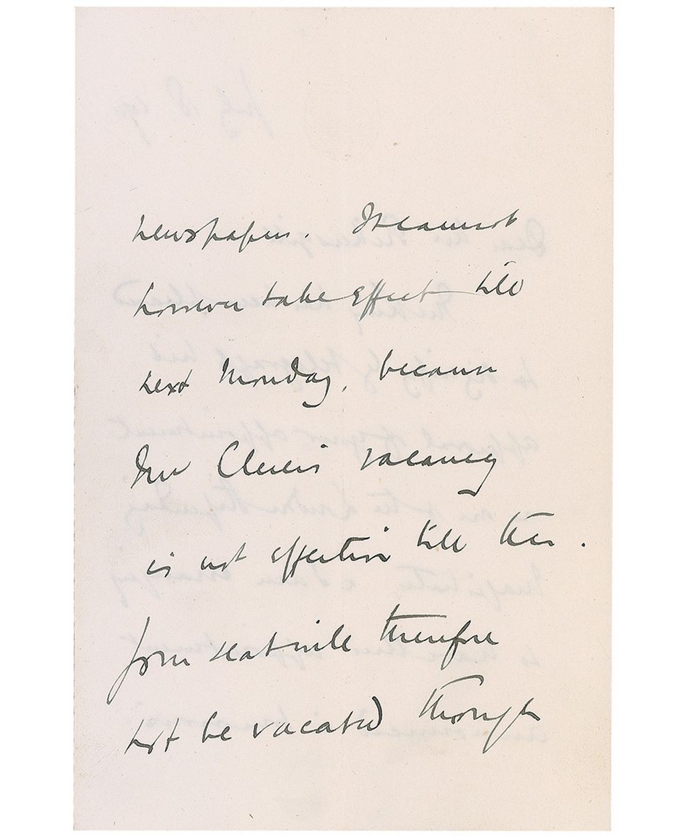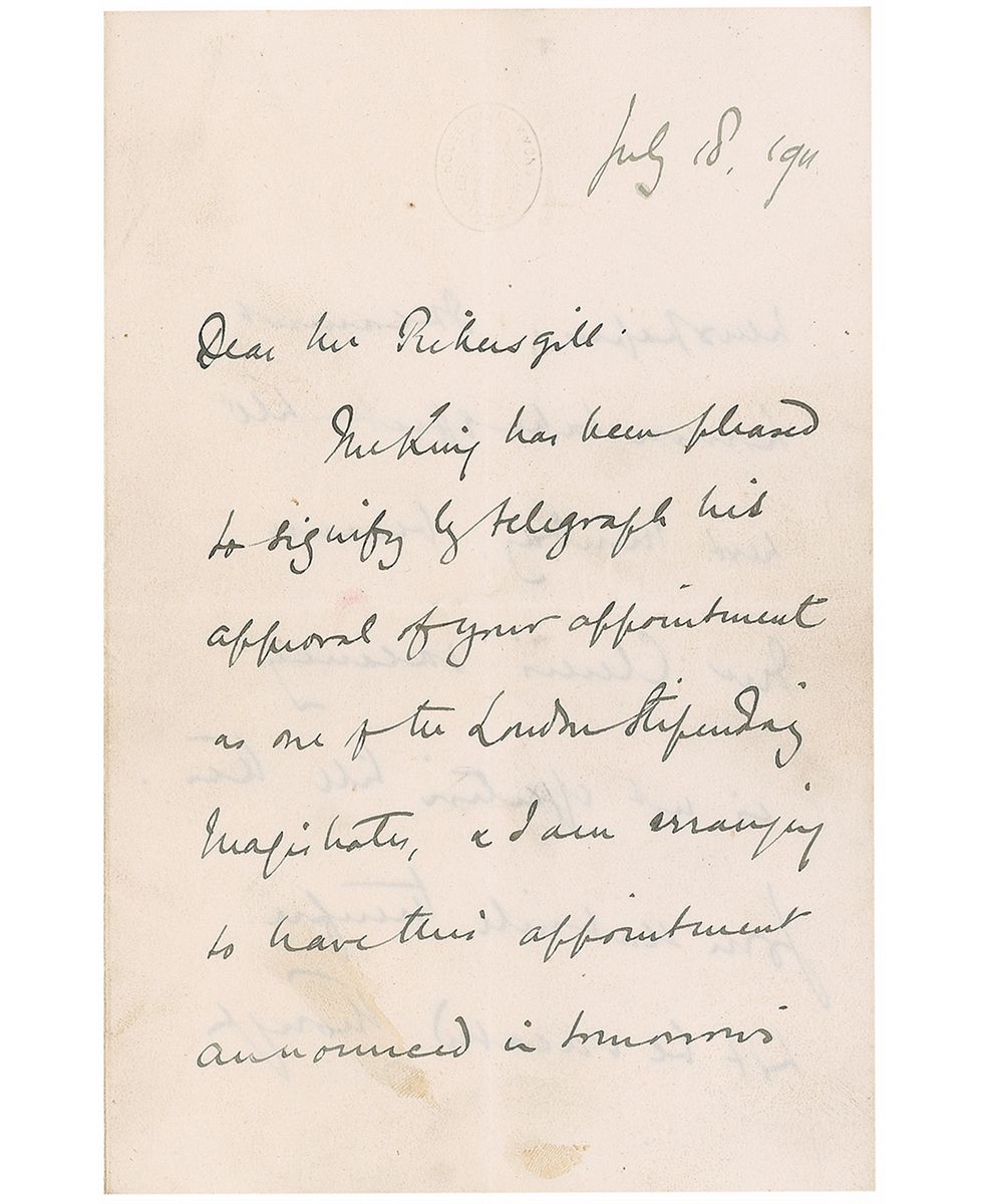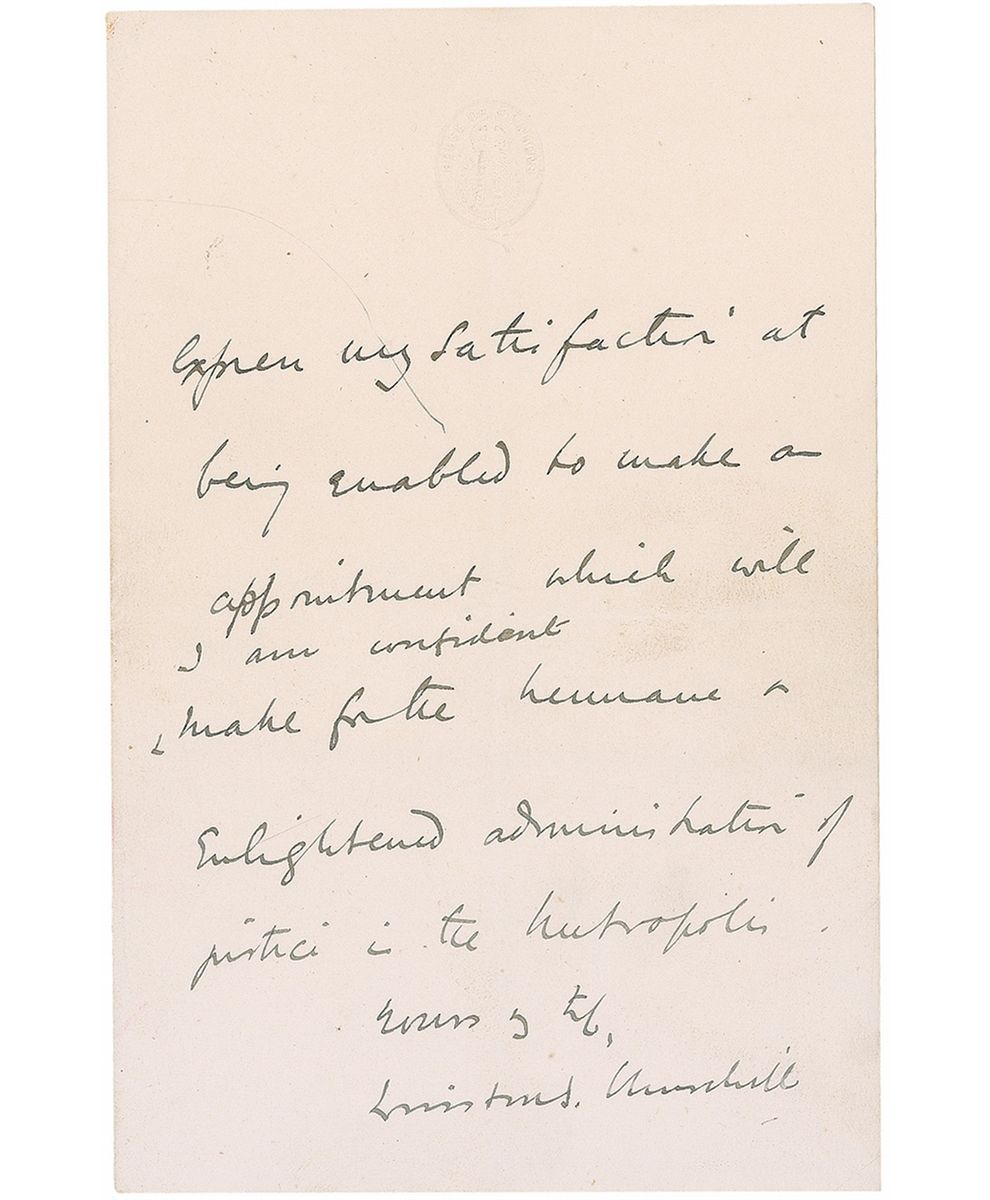 ALS signed “Winston S. Churchill,” five pages on two sets of adjoining sheets, 4.75 x 7.25, House of Commons letterhead, July 18, 1911. Letter to Edward Pickersgill, regarding an appointment as a London Magistrate. In part: “The King has been pleased to signify by telegraph his approval of your appointment as one of the London Stipendary Magistrate, & I am arranging to have this appointment announced in tomorrow’s newspaper. It cannot however take effect till next Monday…Let me again express my satisfaction at being enabled to make an appointment which will I am confident make for the humane & enlightened administration of justice in the Metropolis.” In very good to fine condition, with central horizontal and vertical fold and scattered light toning and soiling. Pickersgill sat in the House of Commons from 1885 to 1911, resigning to become a magistrate. His post was short-lived as he died in October of 1911.