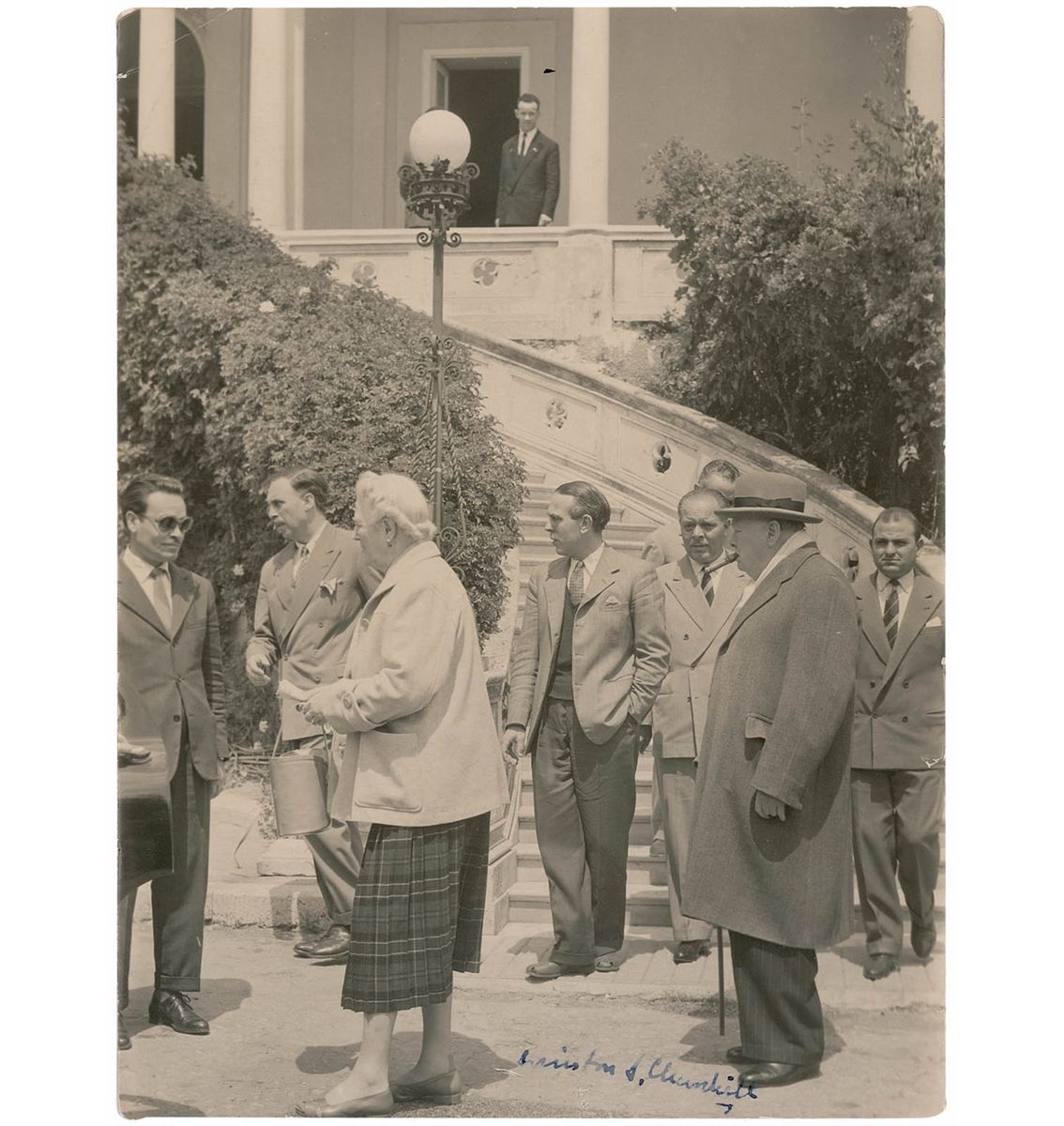Vintage glossy 7 x 9.25 photo of Winston and Clementine Churchill outside, signed in fountain pen, “Winston S. Churchill.” Collector’s notation on the reverse reads, “April 1955 Villa Politi, Siracusa.” In very good condition, with trimmed edges, scattered creases and wrinkles, a couple trivial edge tears, and a bit of irregular ink adhesion to portions of signature.
