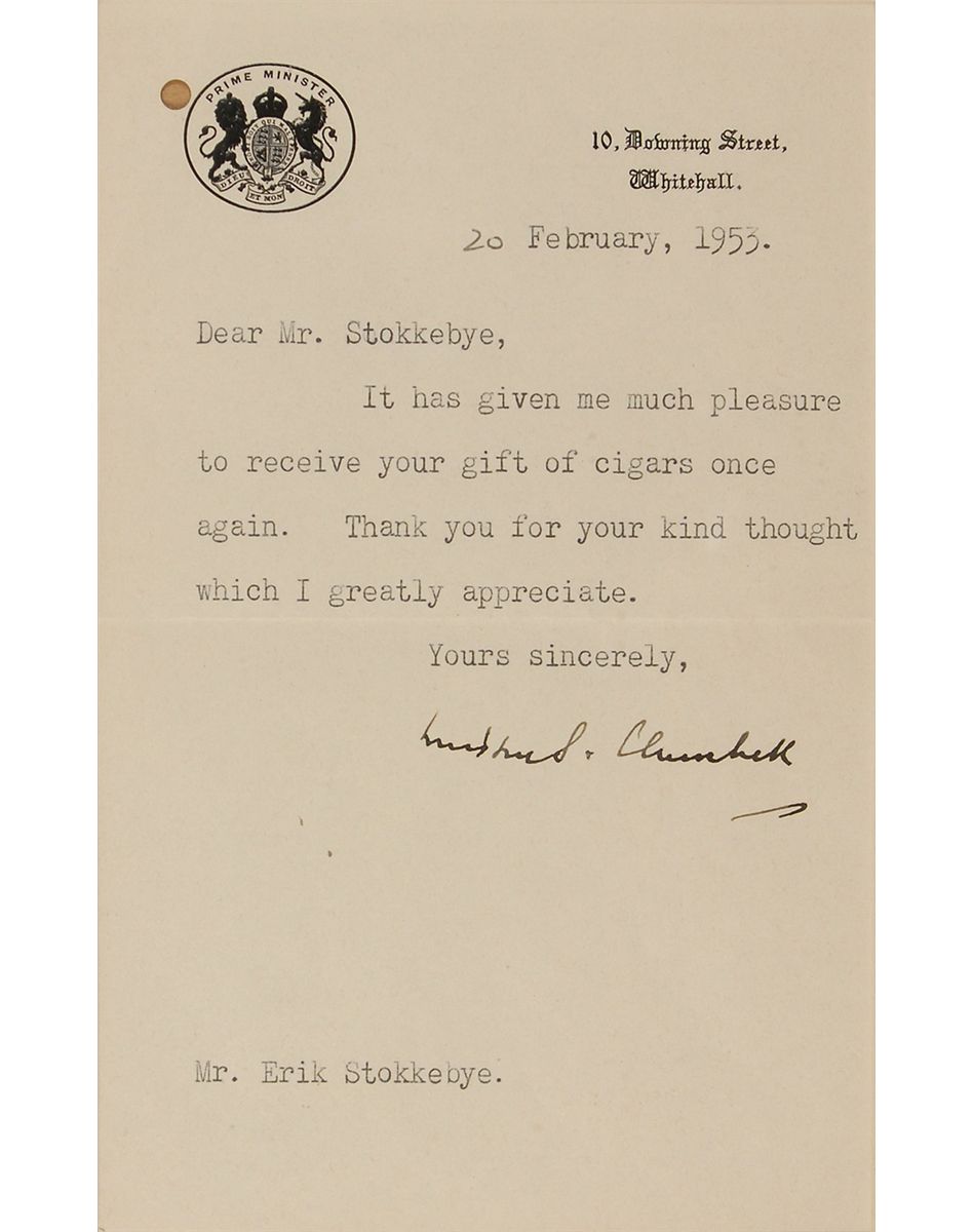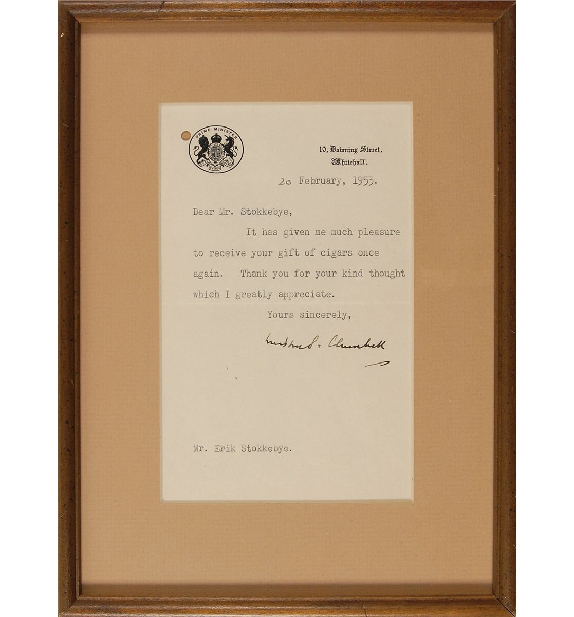 TLS signed “Winston S. Churchill,” one page, 4.5 x 7.5, Prime Minister letterhead, February 20, 1953. Letter to Erik Stokkebye. In full: “It has given me much pleasure to receive your gift of cigars once again. Thank you for your kind thought which I greatly appreciate.” Matted and framed to an overall size of 8.5 x 11.5. In fine condition, with a punch hole to the upper right border. Stokkebye ran the well-known eponymous premium tobacco company, of which Churchill was a client. He was so fond of fine cigars that the 7-inch size has become known as the ‘Churchill.’